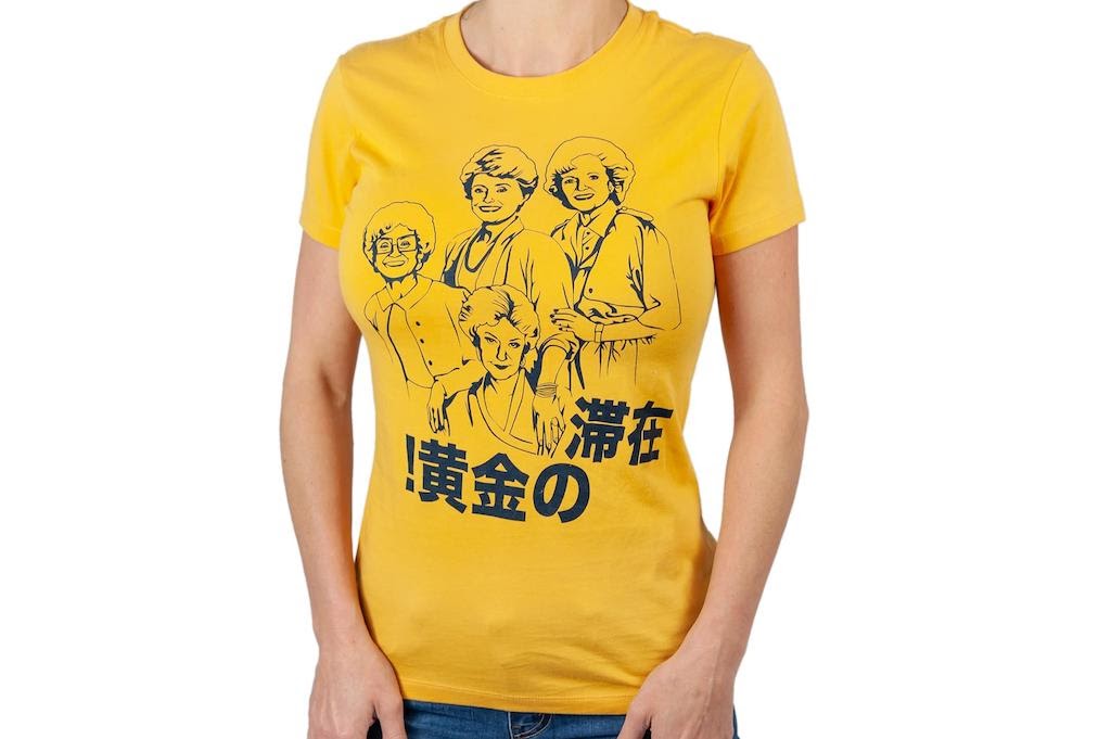 The fearless foursome is all smiles on this sunny colored tee that reminds audiences to stay golden—in Japanese!
