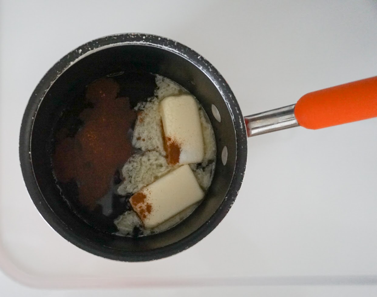 1) Combine water, butter, salt, and 1/4 teaspoon cinnamon in 1 1/2-quart saucepan over medium heat. Bring pot to rolling boil.