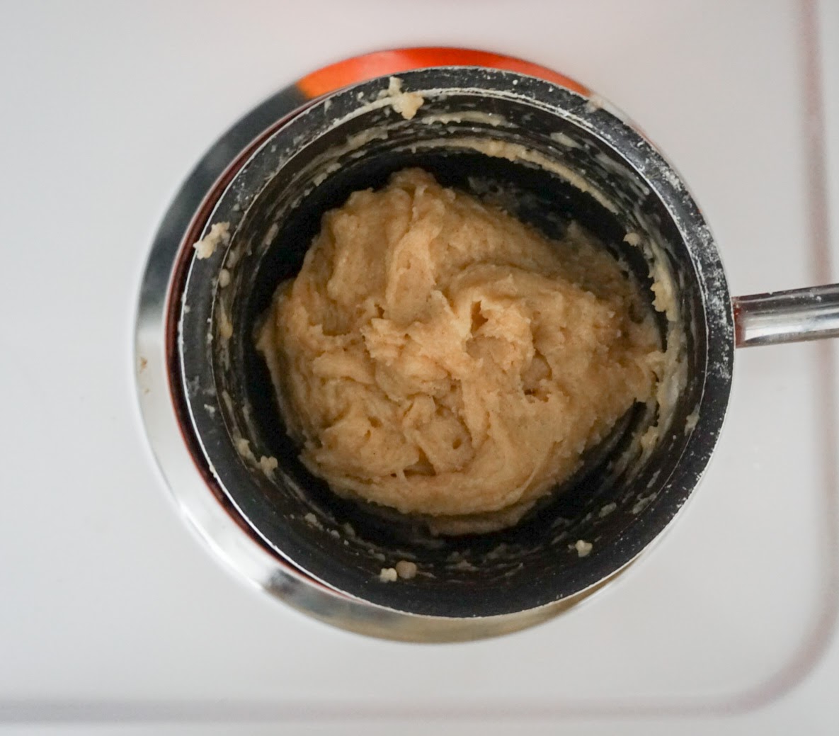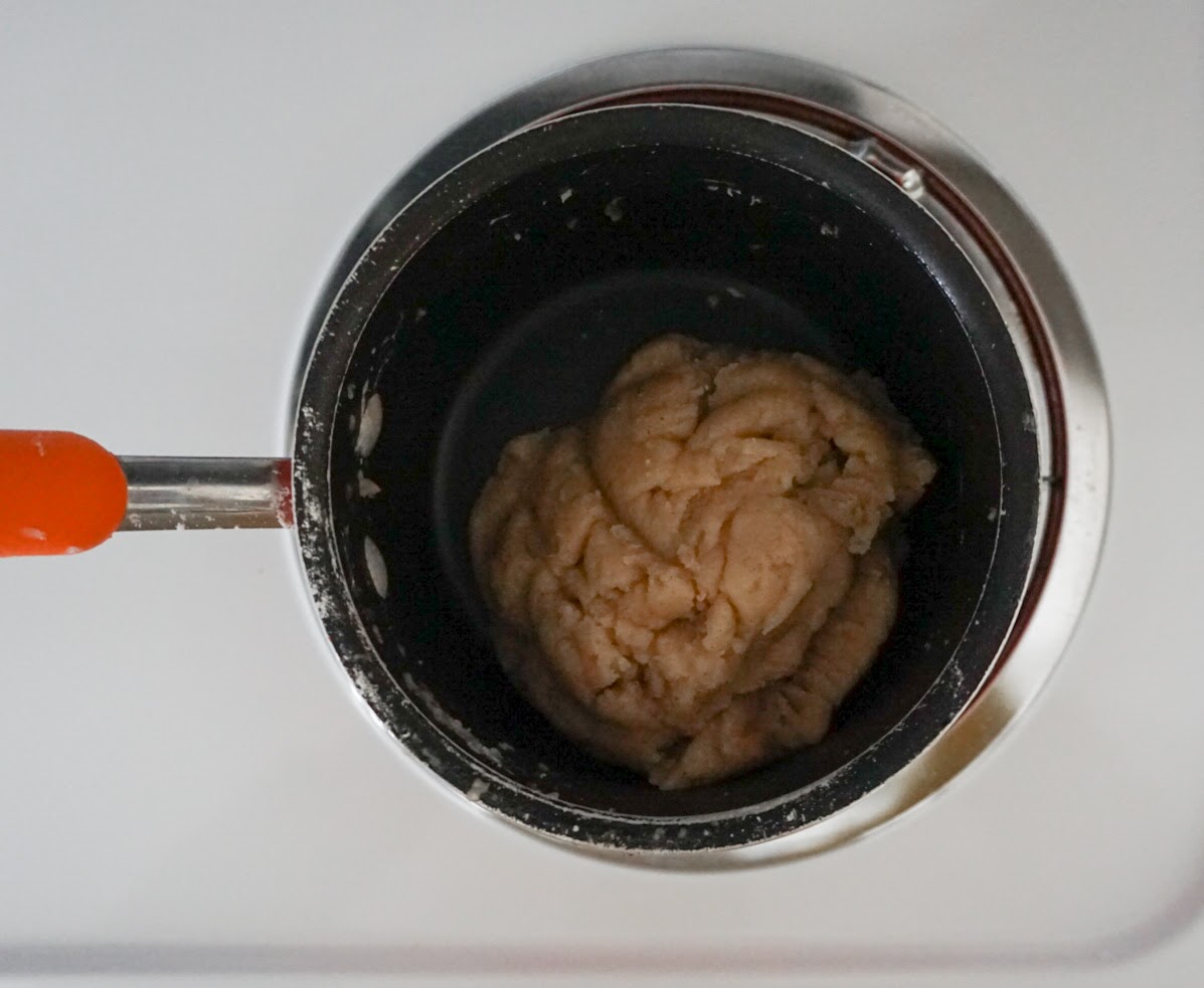 2) Reduce heat to low and add flour and stir vigorously until mix forms a ball. This will happen rather quickly. Remove from heat and let rest for 5-7 min.