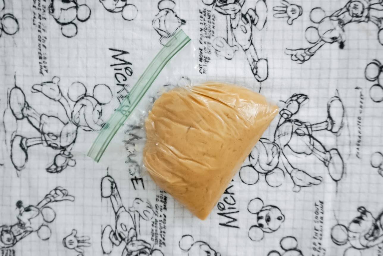 5) Spoon dough into piping bag fitted with large star tip. Don’t have a piping bag? Neither did we. Instead, use a sandwich bag and cut a small opening in one of the bottom corners. This will work just as well.