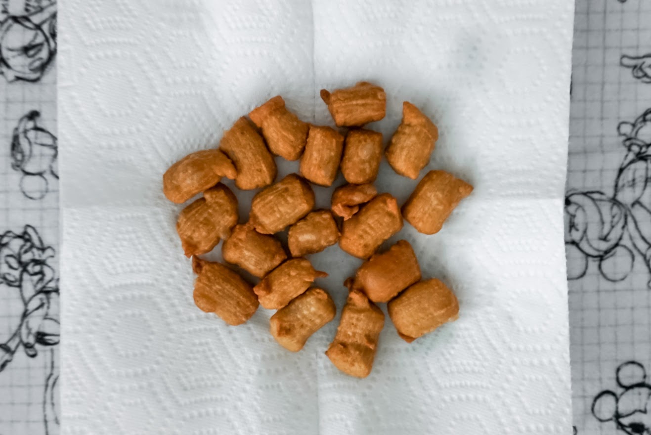 7) Fry churro bites until golden brown. Remove with slotted spoon or mesh spider strainer and drain churro bites on paper towel.