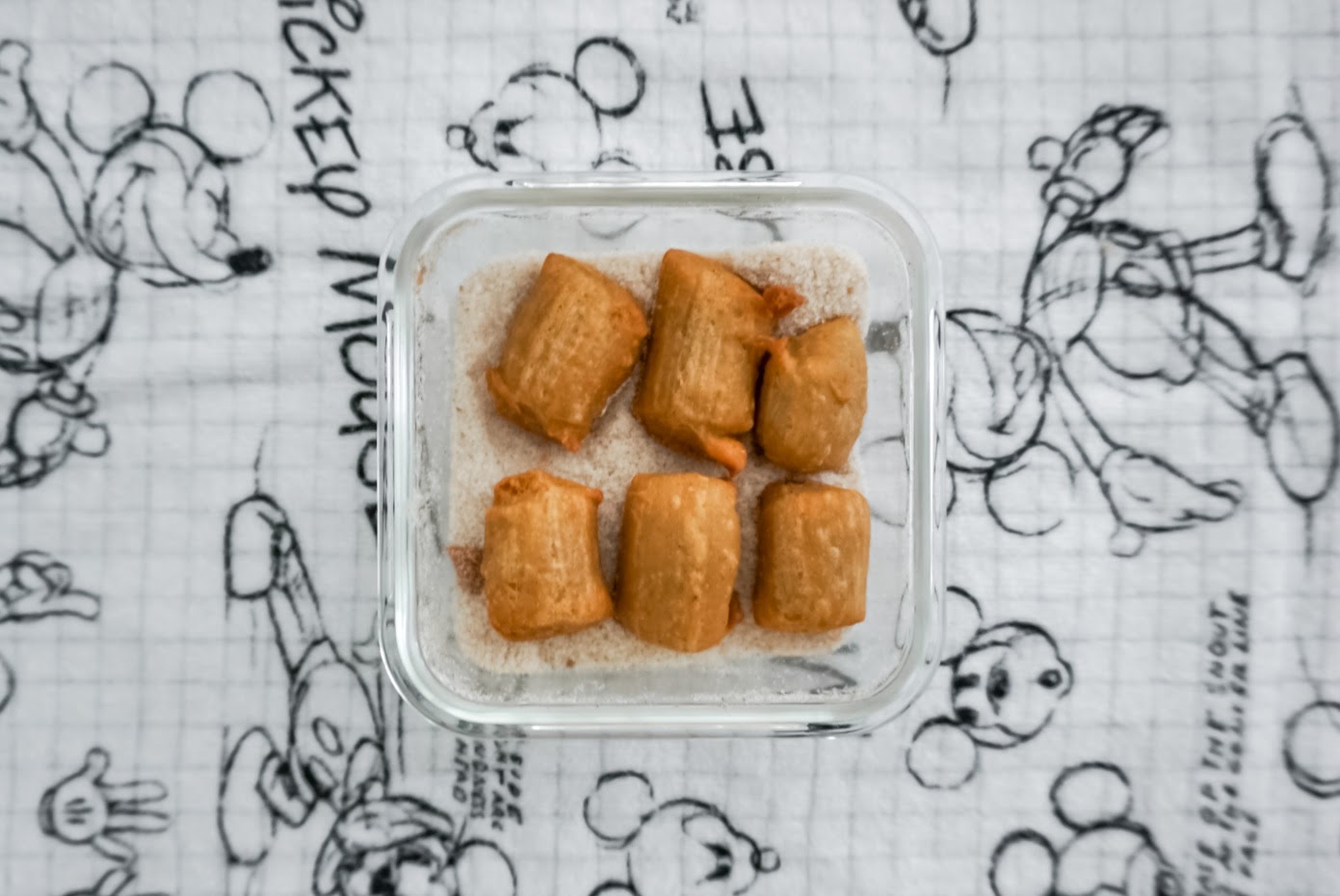 8) Mix sugar and 1/2 teaspoon cinnamon in medium bowl. We use a small Tupperware container for this because it makes the next step much easier.