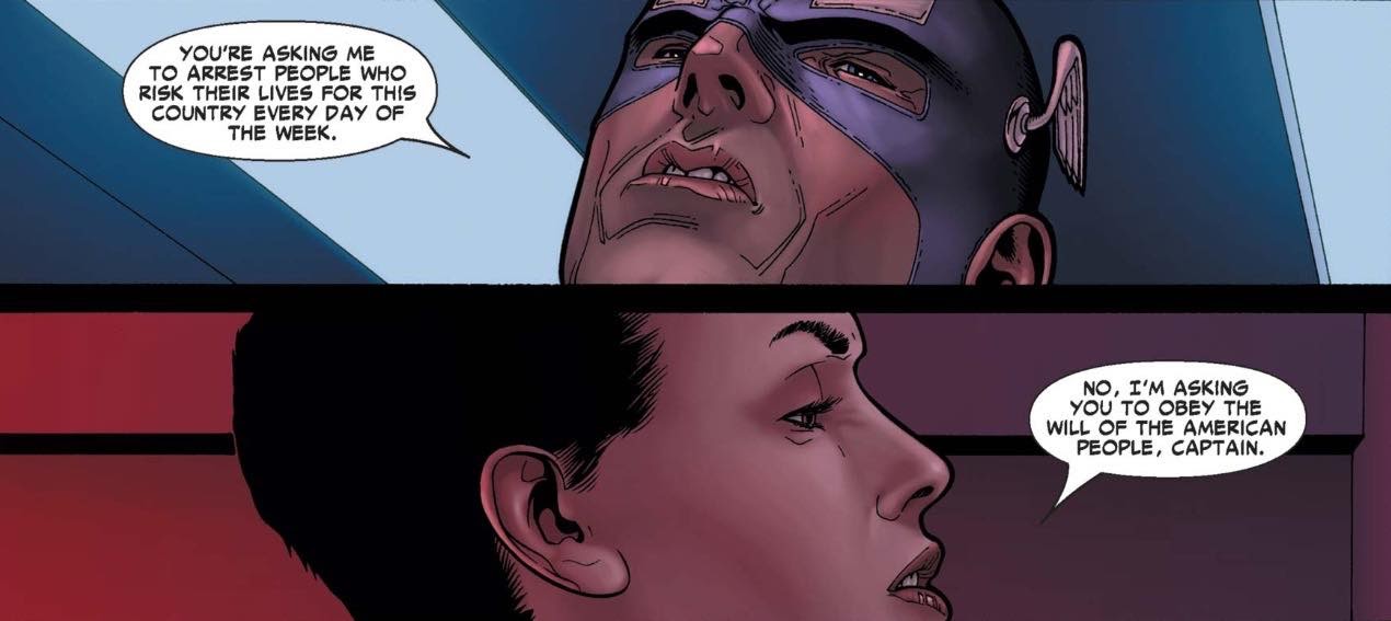 Tony Stark sees no alternative but to compromise with the government and champion the Superhuman Registration Act, which would see all vigilante heroes receive proper training and become employees of the government. Steve Rogers on the other hand, sees this as an encroachment on freedom and refuses to hunt down the heroes who have fought to protect people for so long.