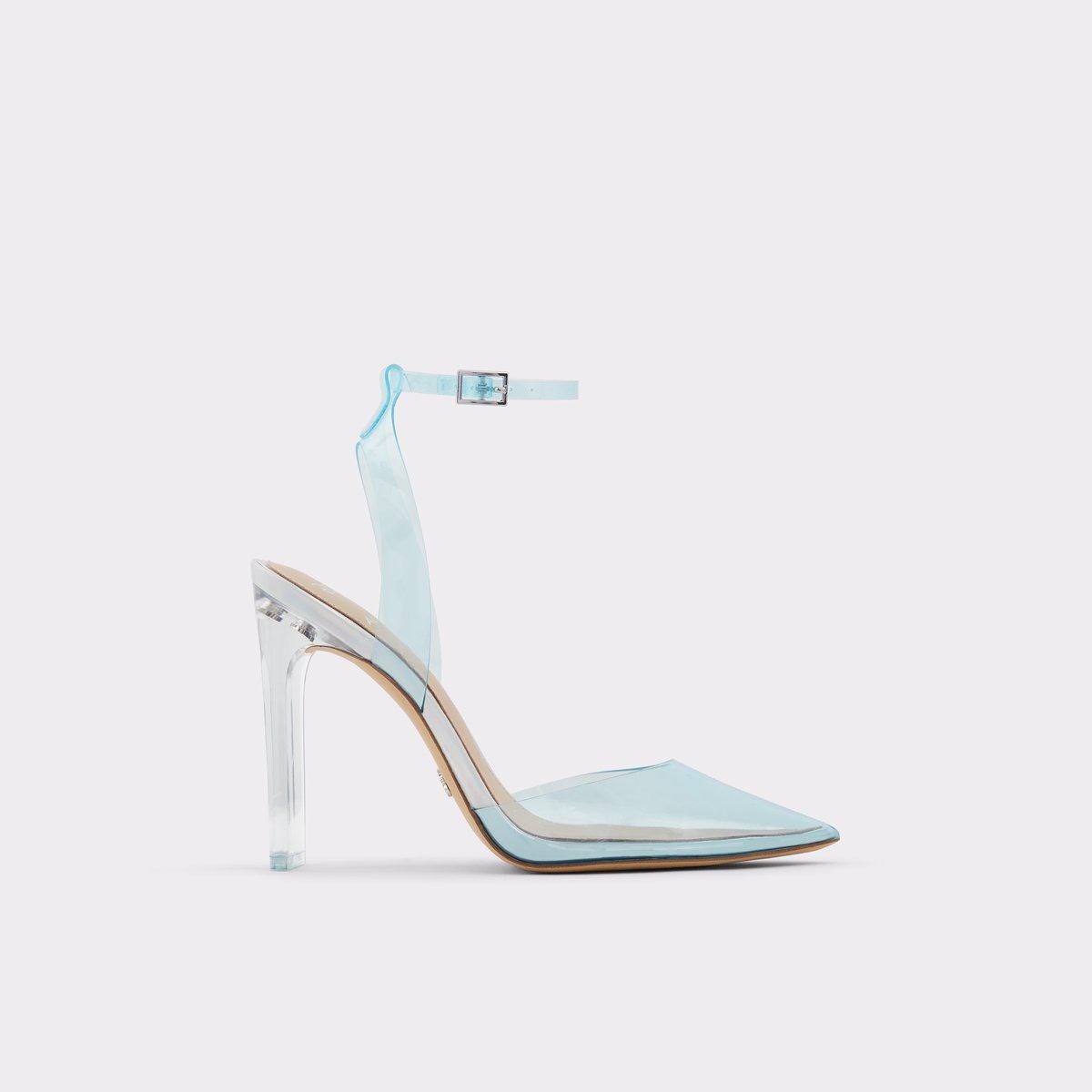 “Step into your very own glass slippers. This fairytale-inspired transparent pump with subtle iridescent details and clear ankle strap will inspire the magic in you.” Available in Blue and Clear.