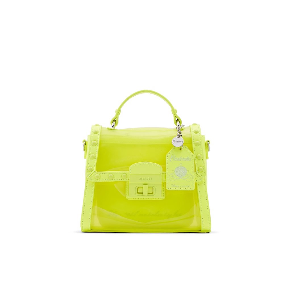 “Hold on to the fairytale with our Cinderella inspired handbags. Blending modern shapes with iconic colours, this top handle handbag features rhinestone embellishment and transparent materials is our futuristic twist on a classic.” Available in Light Blue, Silver, Bright Yellow, and Bright Pink