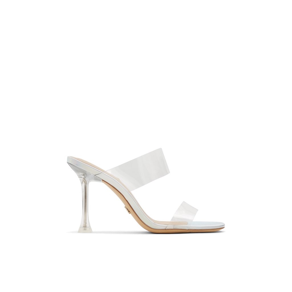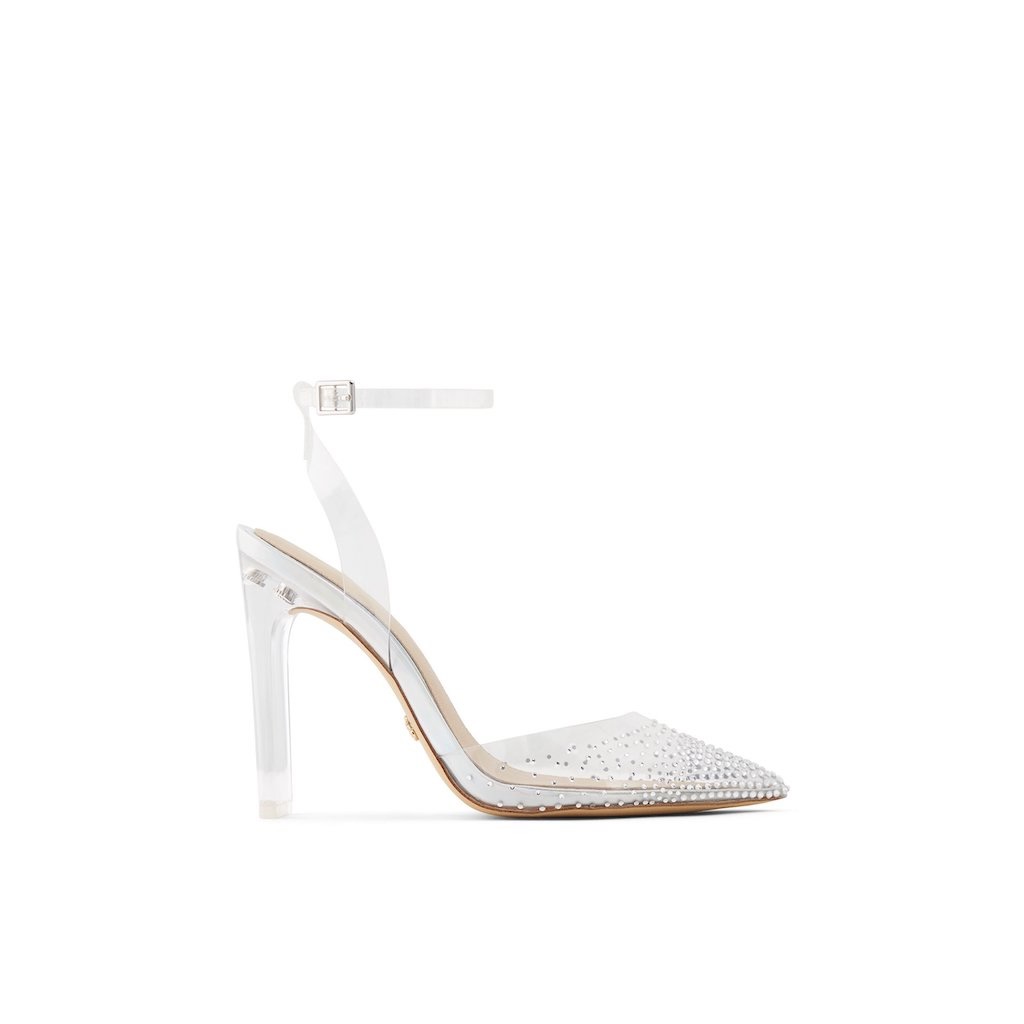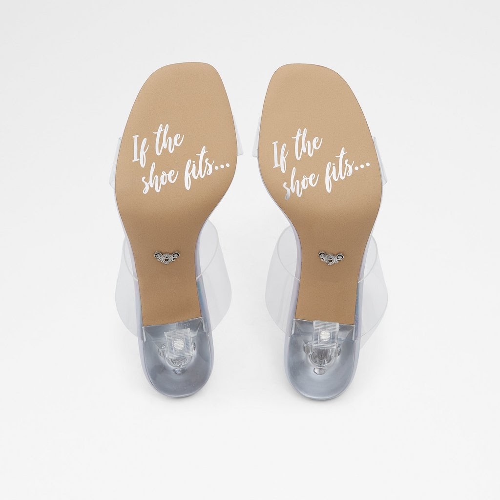 “Step into your very own glass slippers. This fairytale-inspired transparent pump with subtle iridescent details and clear ankle strap will inspire the magic in you.” Available in Blue and Clear.