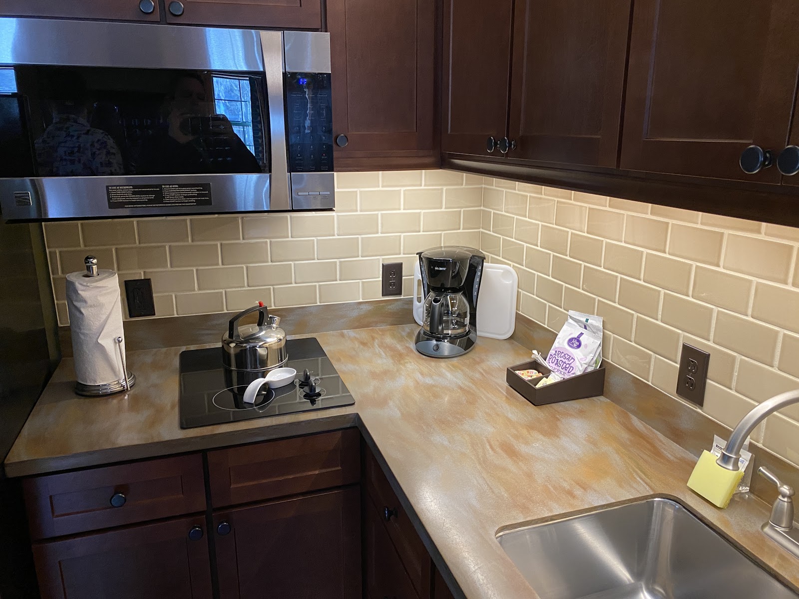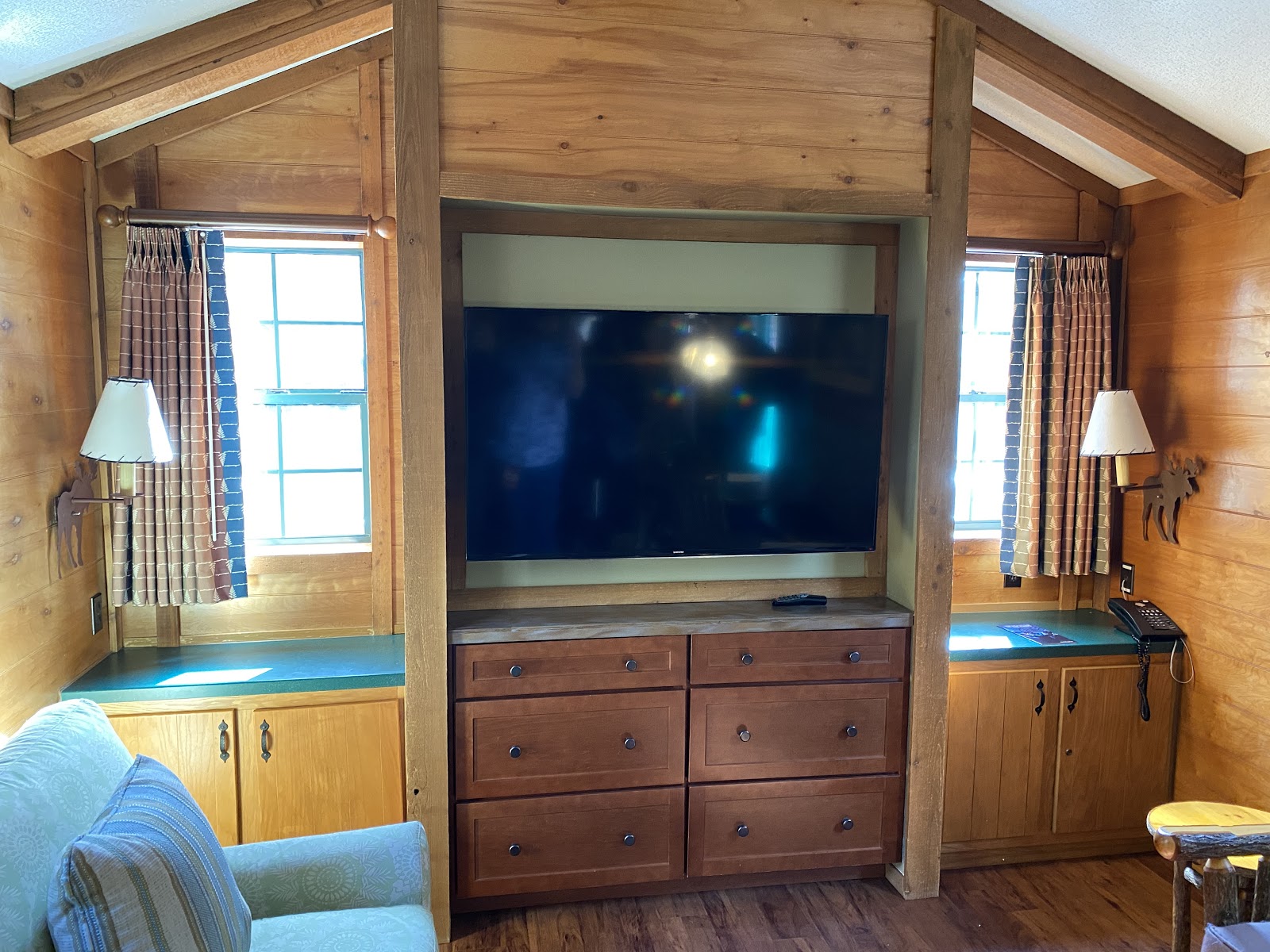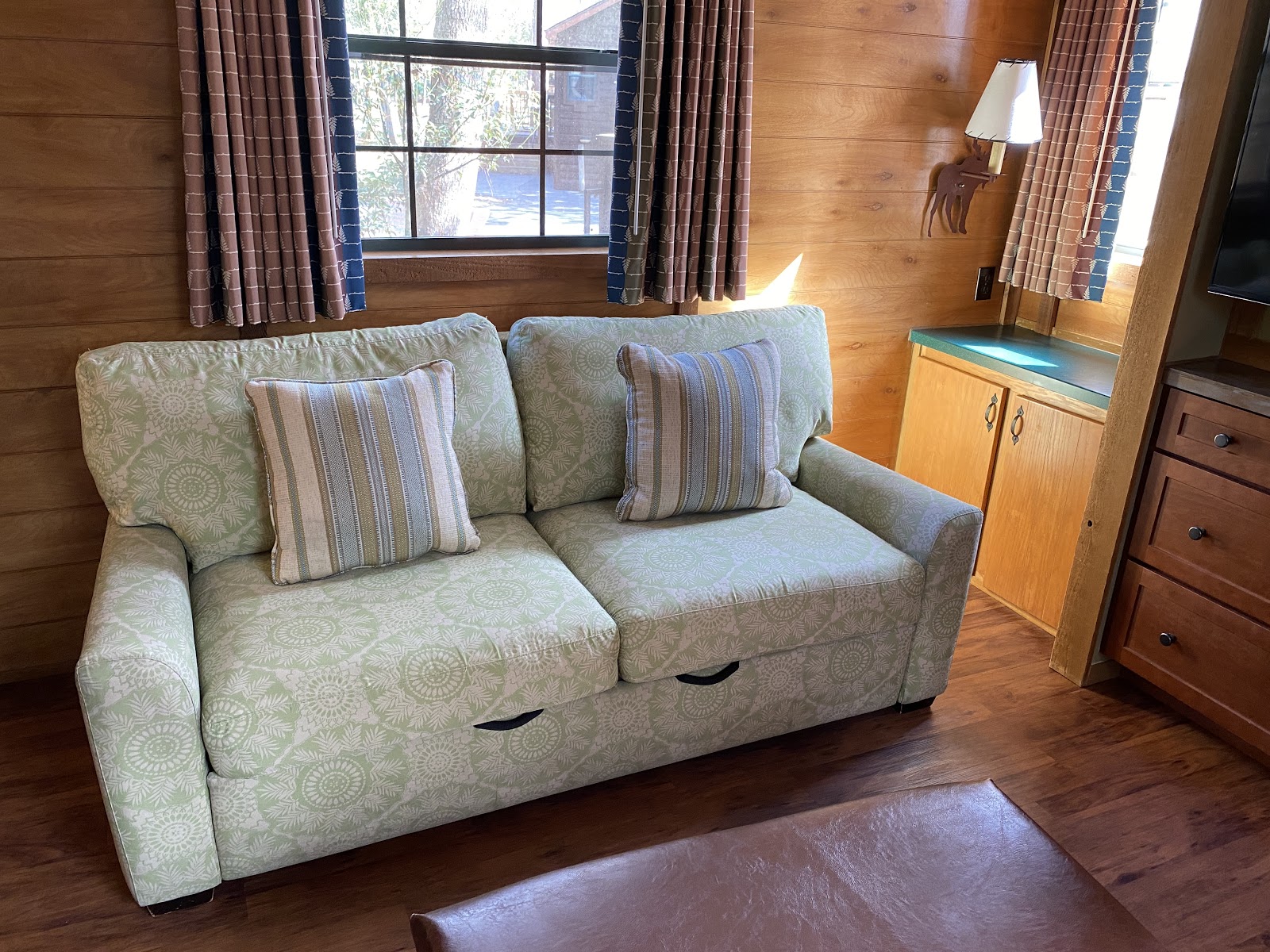 Each cabin is approximately 504 square feet, 12' wide by 42' long, fully air conditioned, and can sleep up to 6. With a private bedroom, complete with a queen bed and bunk beds, a fold-out double size sleeper sofa in the living room, a fully equipped kitchen, and a private indoor bathroom, this is most definitely not your average campout.