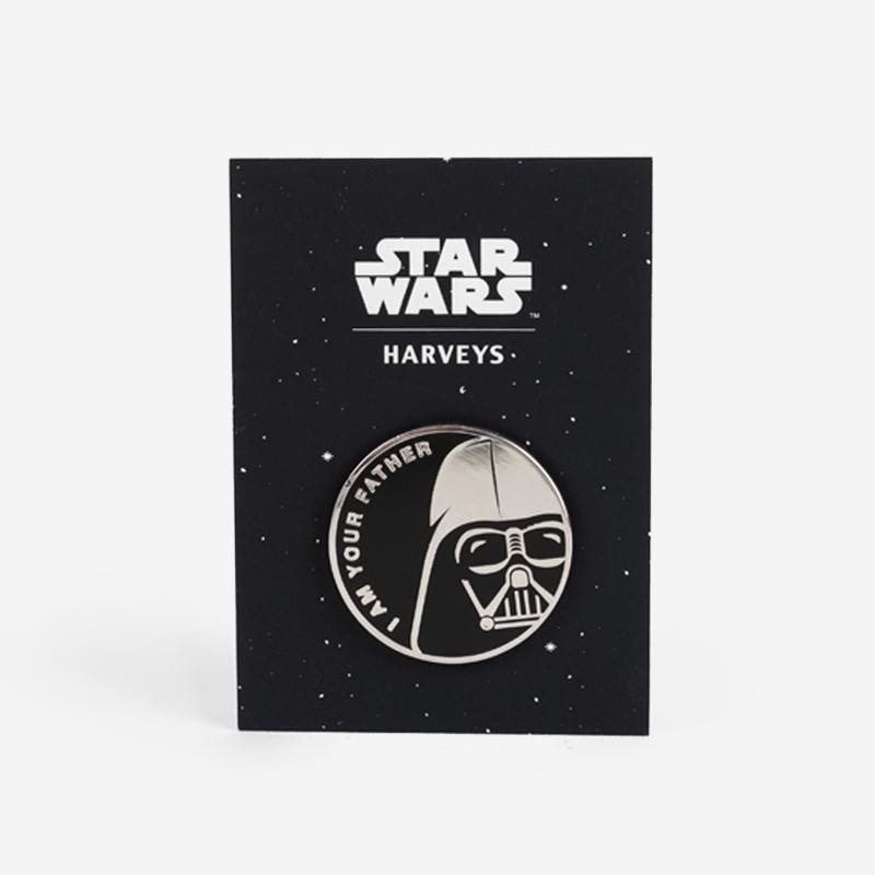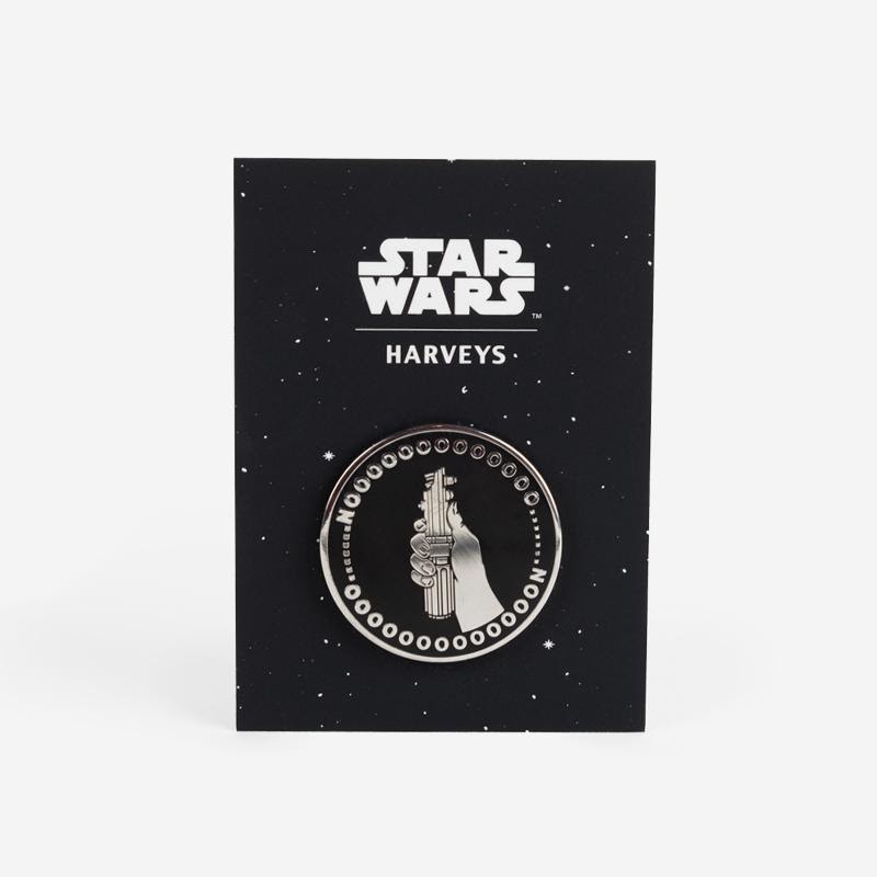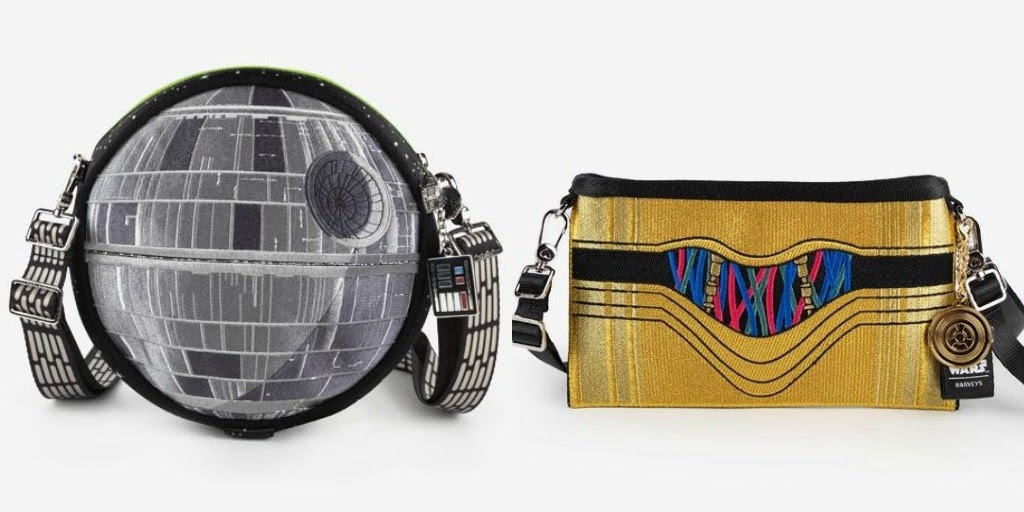 “Harveys created a fun print featuring iconic scenes and favorite characters from the movie that started it all. Thoughtfully color blocked with an all-new galaxy print and fully lined with the exciting space battle liner. Wherever your loyalties lie, you can choose a side with the double-sided Imperial and Rebel insignia charm.”