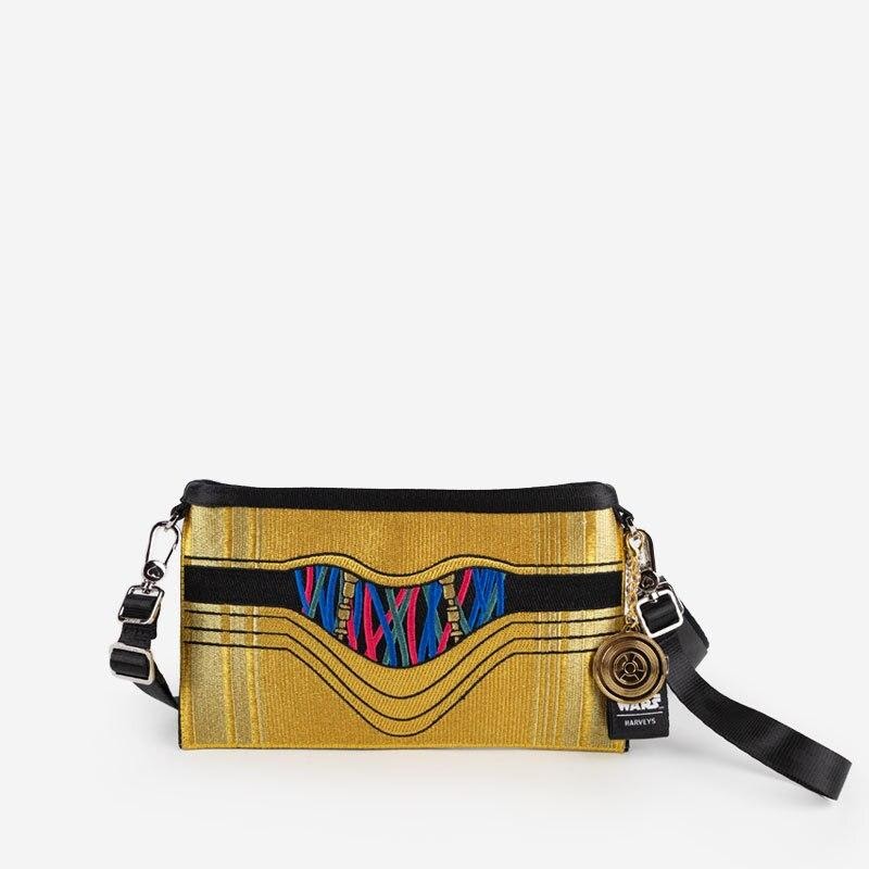 “Shimmering gold embroidery and vibrant-colored wires to mimic C-3PO's waist area - just where you can wear this hip pack! The shiny gold charm is inspired by C-3PO's signature circular pattern from his chest and is fully lined the our exciting space battle liner.”