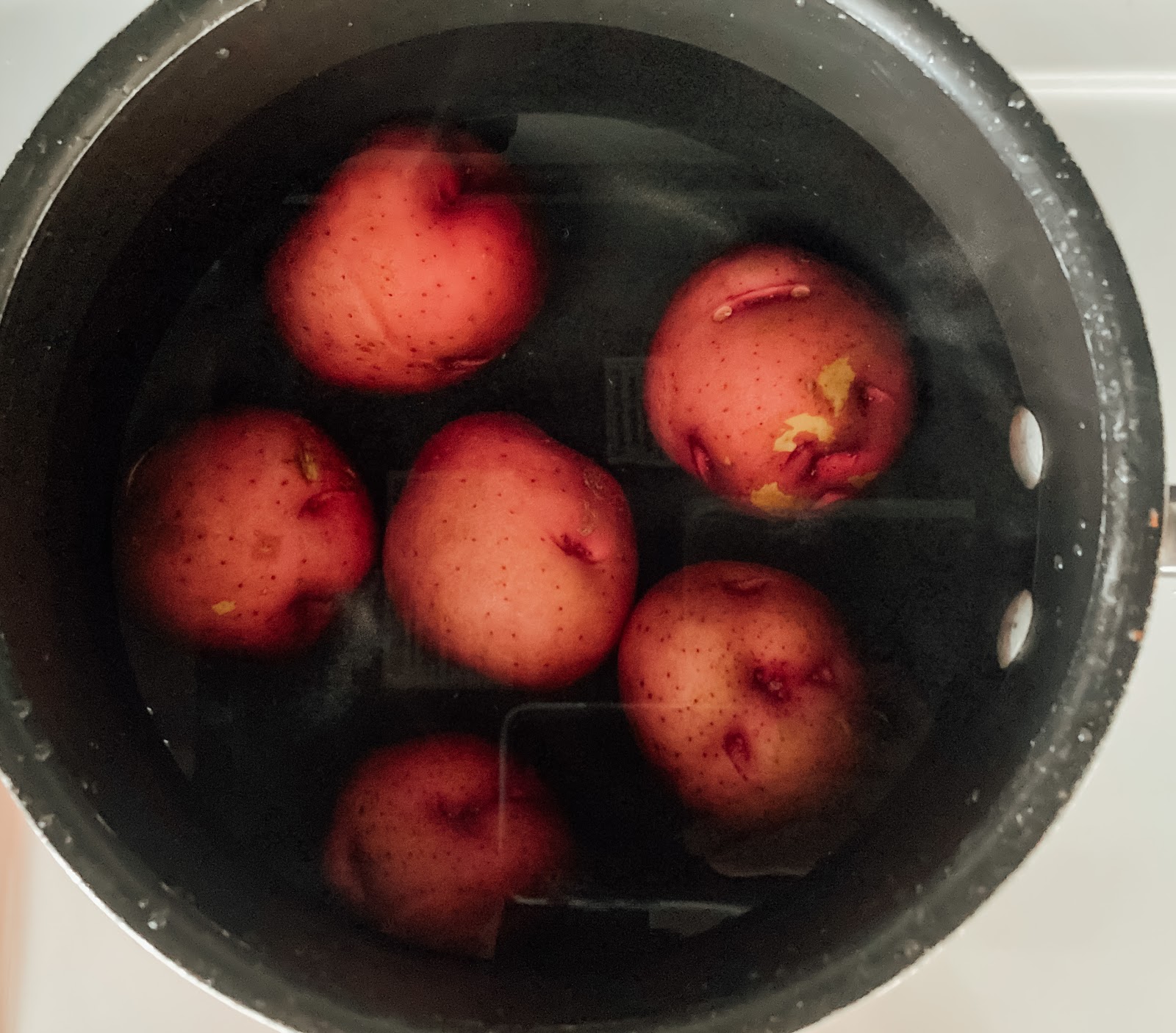 1) Place potatoes, water and 1 tablespoon of salt in a large pot. Bring to a boil over high heat, cover and reduce to a simmer. Continue simmering for 15 minutes, until potatoes are fork tender. If using red potatoes, like we did, I would let them simmer a bit longer. Maybe just a few more minutes.