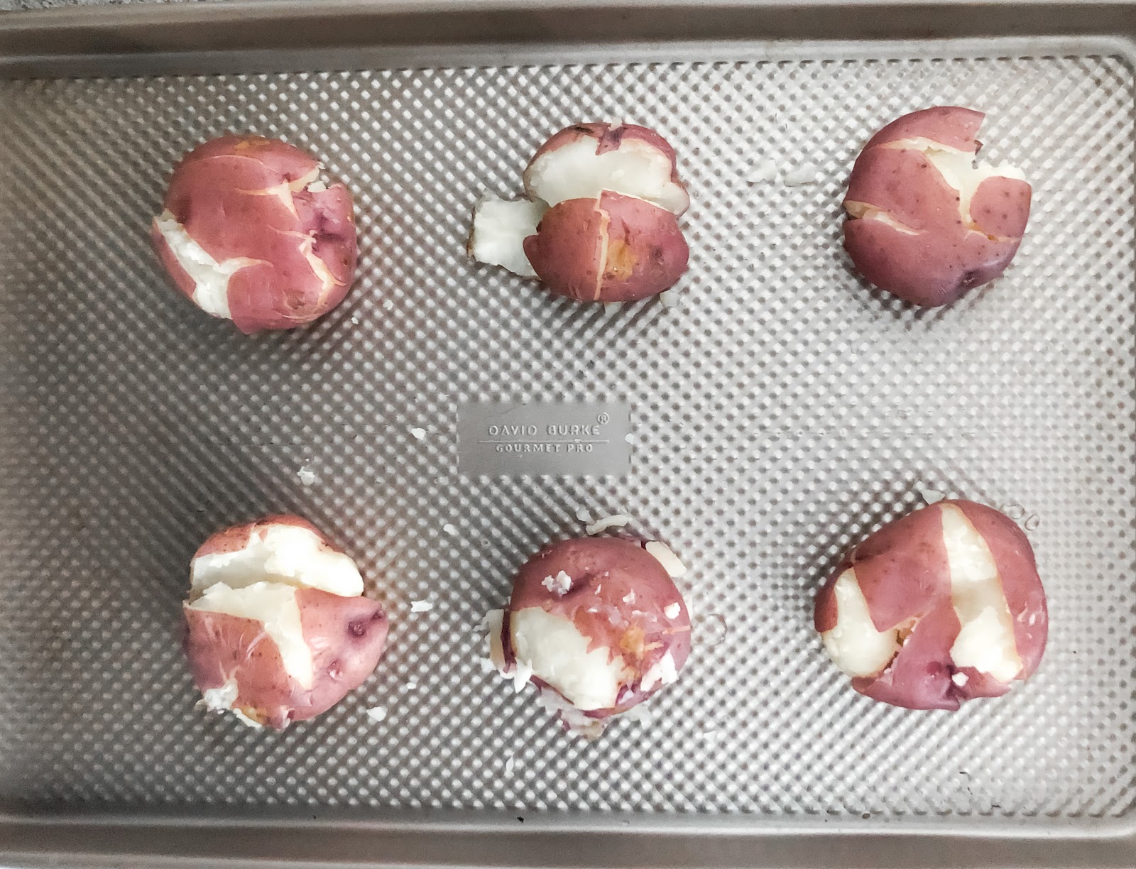 3) Place a small plate on top of one potato, and gently push down, until the potato is 1/3 of its original size and just begins to split open on the side. Repeat with remaining potatoes. The red potatoes did not split quite as easily as we had hoped, thus letting them simmer a bit longer. This will likely be easier with smaller gold potatoes.