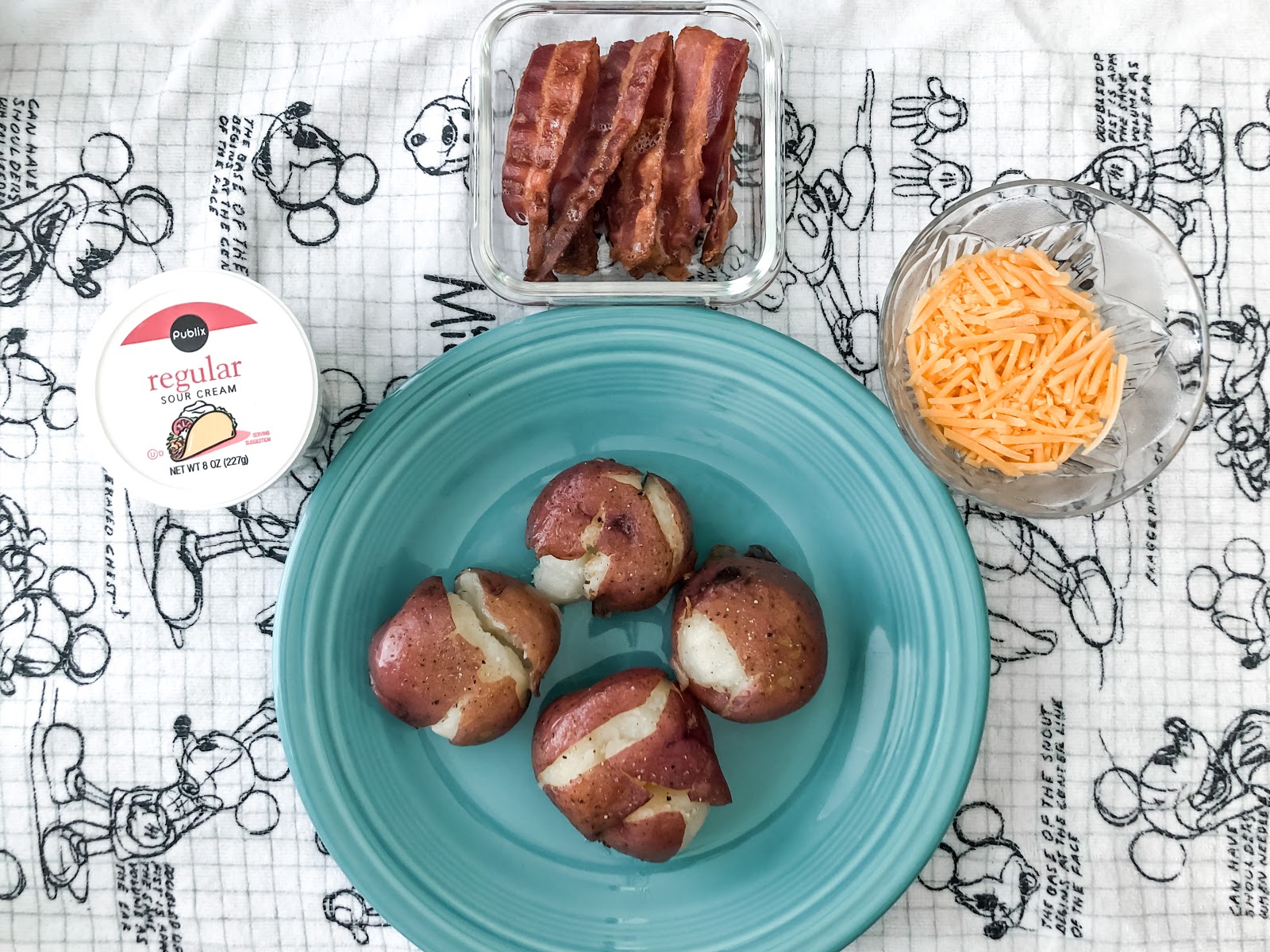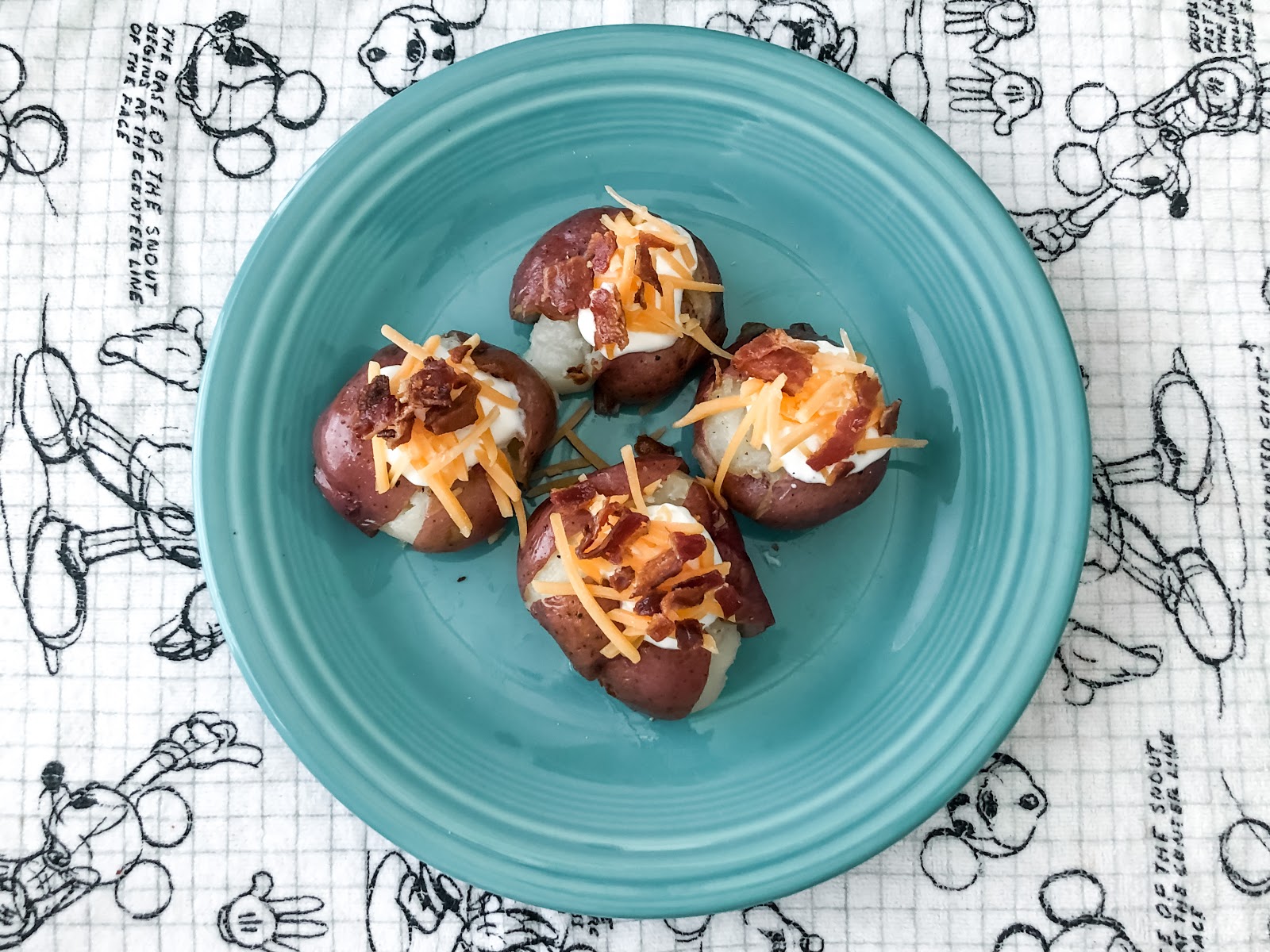 8) Top each potato with 1 teaspoon of sour cream, 1/2 teaspoon chopped bacon, 1 teaspoon shredded cheddar cheese and 1/4 teaspoon of chives. These of course are the recommended amount, but really, it’s your potato. Top it with whatever you like and as much as you want!