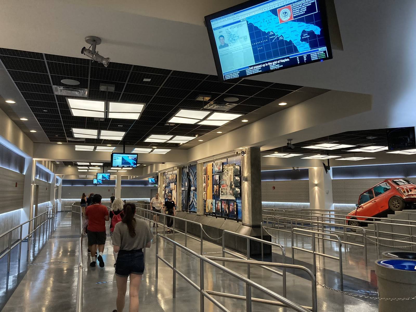 Once back inside the building (the outdoor section is skipped if you are directed to the left), guests will find several shots from the popular Bourne films on the walls, as well as a couple of prop vehicles. Additionally, there are dozens of monitors throughout the queue showing clips from the movies.