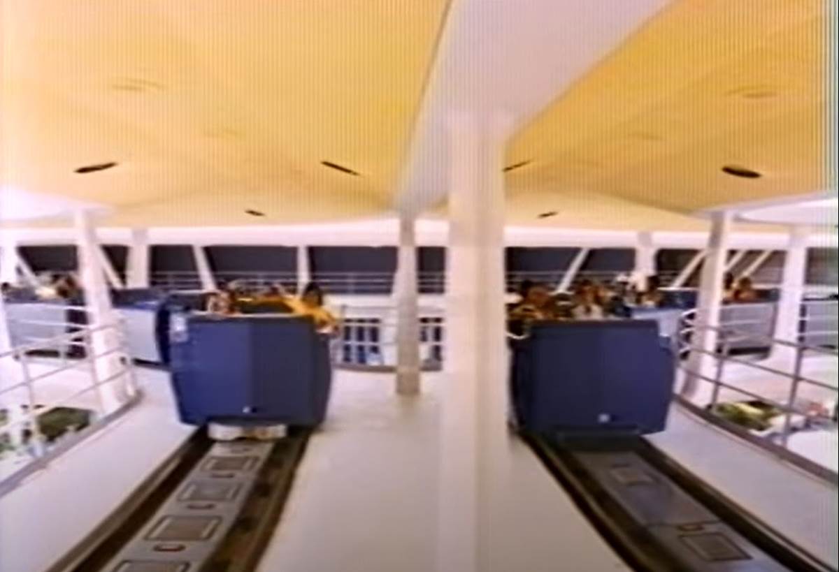 This remained relatively unchanged until the New Tomorrowland of 1994, when the most drastic change occurred to the WEDway Peoplemover as it became the Tomorrowland Transit Authority (TTA). Specifically, it became the Tomorrowland Transit Authority Metroliner Blue Line, as there were other fictitious routes as Tomorrowland (thematically) became a sort of intergalactic downtown environment. New scenes were added to interior corridors, and a whole new narration by Peter Renaday took over the route of the attraction. The TTA also helped tie the whole story of the new Tomorrowland together, identifying and sharing the backstories of the individual attractions subtly while also keeping the tradition of the high in the sky tour. Example: When passing The ExtraTERRORestrial Alien Encounter, the TTA narration wouldn’t point out simply the name of the attraction, rather that you were passing by the Tomorrowland Interplanetary Convention Center mentioning the current exhibitor, XS-Tech and their Teleportation machines.