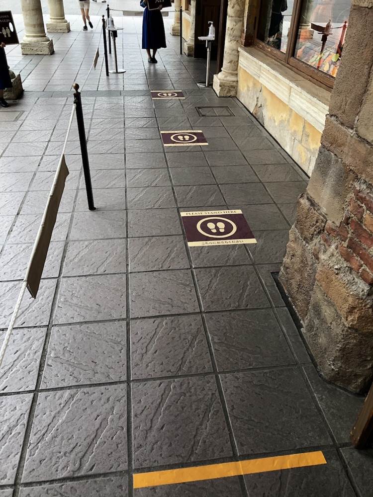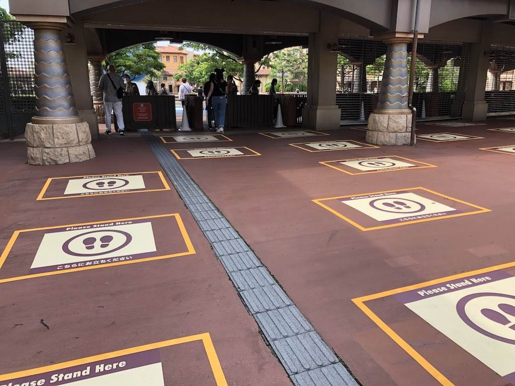 Further into the park queue lines also feature floor markings to help guests maintain proper social distancing. The line of Soaring Fantastic Flight goes quite a way back! Coupled with the extra distancing, the standby queue reaches into a completely different land! The Soaring entry is located at Mediterranean Harbor and the end of the queue goes all the way to Mysterious Island.