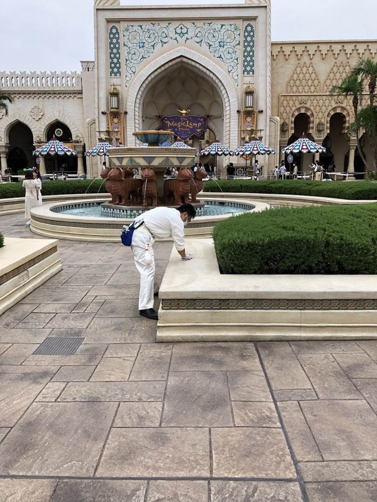 Tatsuya also snapped a photo of a custodial Cast Members cleaning off a space where guests can sit.