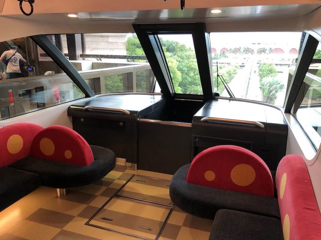 Inside the observation car are individual seats and a bench with a design inspired by Mickey’s iconic look. There are also Mickey Mouse-shaped hand grips for those who want to stand while riding.