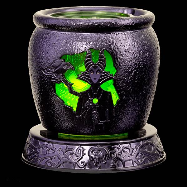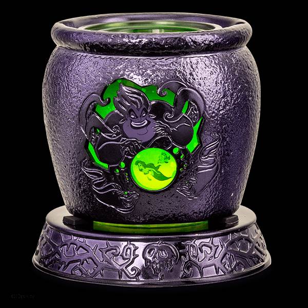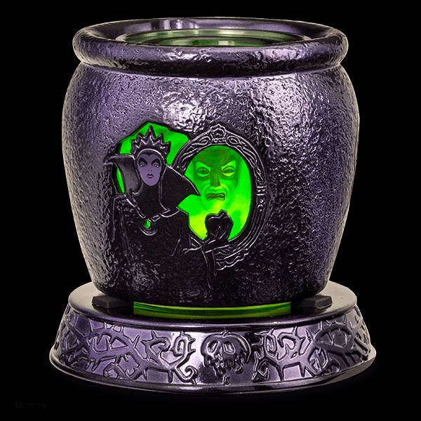 The Disney Villains Scentsy Warmer looks like a cauldron and features three characters around the base: The Evil Queen, Maleficent, and Ursula. Turn on the green light to reveal etched accents in the glass including the Magic Mirror’s face and Ariel swimming in Ursula’s crystal ball. The green glass wax trey features the poison apple on the bottom.