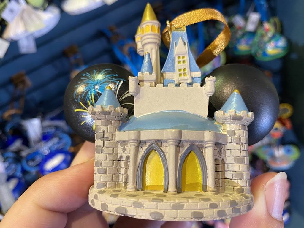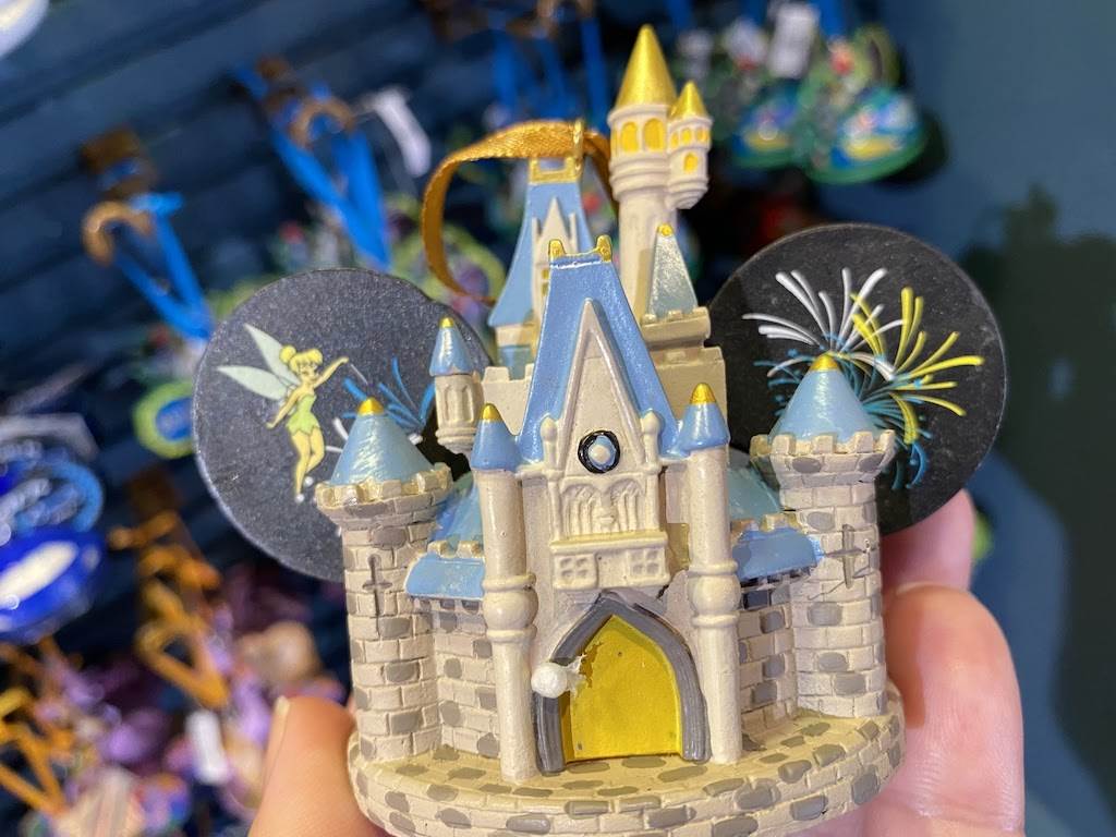 Magic Kingdom’s center icon looks great no matter the size. This design features a wand waving Tinker Bell adding a touch of pixie dust to the castle during the nightly fireworks spectacular. But that’s not all, this lovely ornament lights up too!