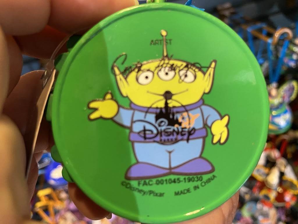 Oooo! Alien Swirling Saucers get the main spot on this colorful ornament and the little green man at the controls seems to be having a great time. The land’s marquee is on display on the right ear, while Slinky of Slinky Dog Dash is hanging out on the left side. And finally, the iconic Pixar ball featured on the bottom.