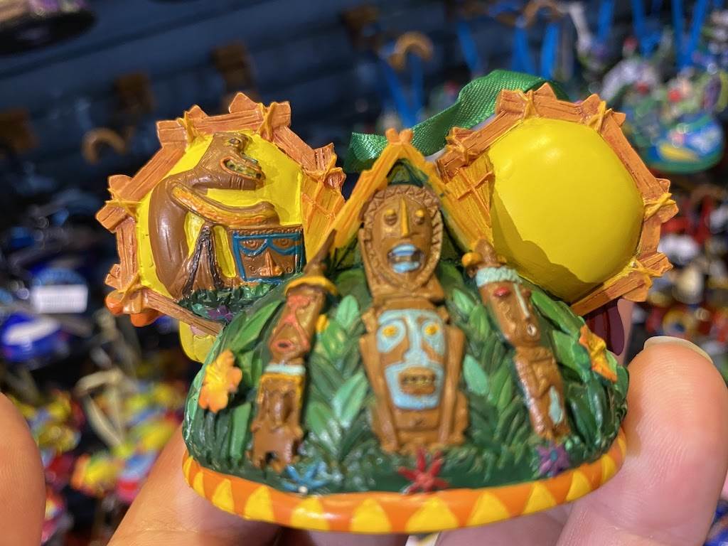 You’ll croon and coo—just like the birds and flowers in the opening day attraction—when you see this colorful Tiki Room ornament. The front features birds and flowers; the back has tiki statues; and the bottom has a tiki idol.