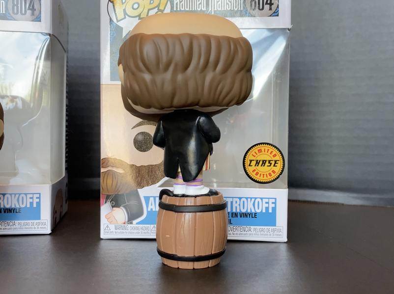 The other stretching room portrait character in this collection is Constance Hatchaway. Like Alexander Nitrokoff, there is a Chaser variant of Constance. The standard figure, as seen in our photos and video, features the character on the top half of her “Dear beloved George”’s tombstone. With the variant, the full tombstone materializes, complete with the carved head of George, whose life was cut short by a hatchet to the head.
