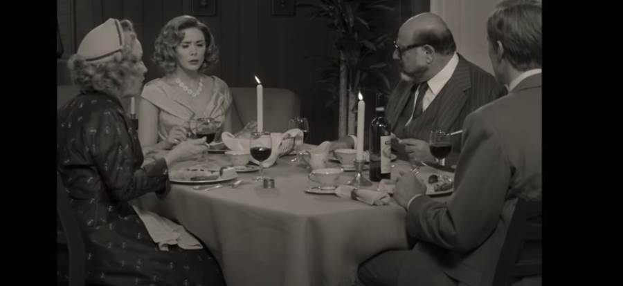 As we see a couple of shots of Wanda using her powers to pour a bottle of wine, we hear a voice asking “Where did you two move from, how long have you been married and why don’t you have children yet?” The questions spark some disembodied laughter, as if the show is a sitcom shot in front of a studio audience.