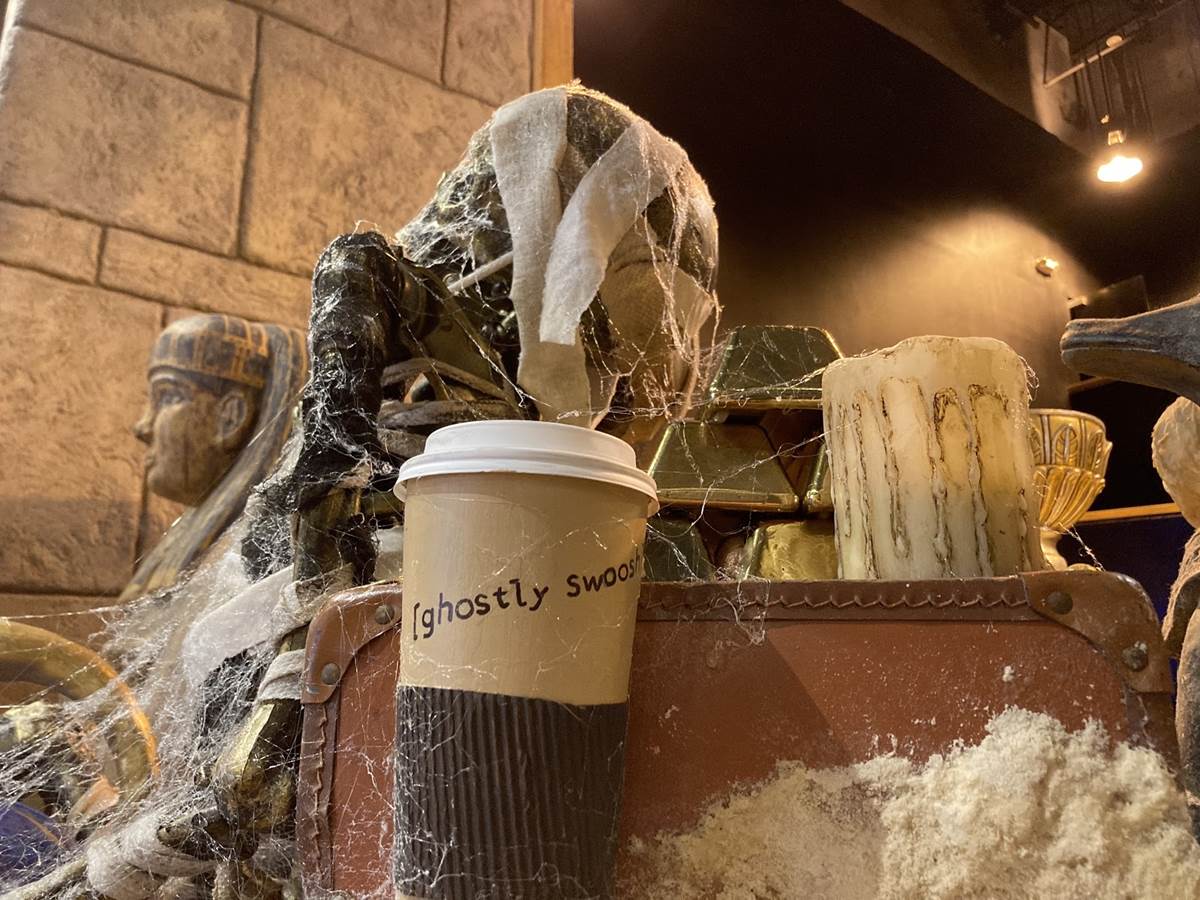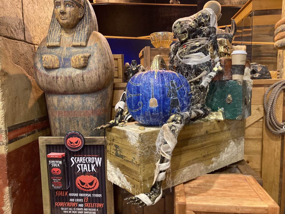 Some of the scarecrows even feature some fun Universal Easter Eggs, like the one found in the Revenge of the Mummy gift shop, Sahara Traders. Guests familiar with the attraction might just spot the elusive coffee cup with a familiar message on it.