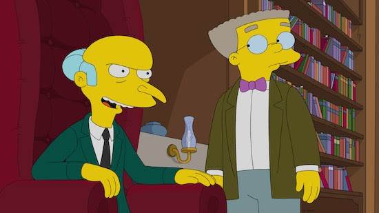 At Burns Manor, Smithers paces the floor waiting for his boss to return home: “I’m supposed to read him his bedtime story.” Burns finally enters and says he had the greatest night of his life: “I’ve had frenemies, but they were all French enemies… never a friend.” When Smithers attempts to bring up the subject of a pending union dispute, Burns responds, “The only union that concerns me now is the union of men; what would you know about that?” Meanwhile, the Simpson family is upset that Homer is spending so much time with Fred-- citing Laga Gaga’s brief visit to Springfield (she inspired Lisa then disappeared forever) as a cautionary tale. At work, Fred tells off Smithers and the other guys are impressed. Lenny suggests Fred ask Burns for a better benefits package. Burns agrees, though the robot body begins to malfunction.