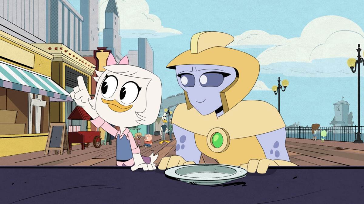 This all adds up to a fairly low-stakes but entertaining and playful half-hour, wherein the gang does their best to help Penny come to love her adoptive home, Dewey finds a new nemesis in a camera-hogging pig named Timmy Jenkins, and Glomgold once again gets his comeuppance for being a day late and a dollar short. There’s also some great action and comedy along the way. With that in mind, I do want to note that there is at least one absolutely unforgettable joke in this episode (see the embedded tweet above from series developer / producer Frank Angones), and that’s the one where Penny is trying to differentiate between the ducks they’re feeding popcorn to on the pier and the ducks that are her young anthropomorphized friends. It’s a very meta comment on the puzzling reality of Disney’s whole Mickey-and-Friends universe, but it fits right in among the irreverent humor that’s become one of DuckTales’ most recognizable trademarks in its current iteration.