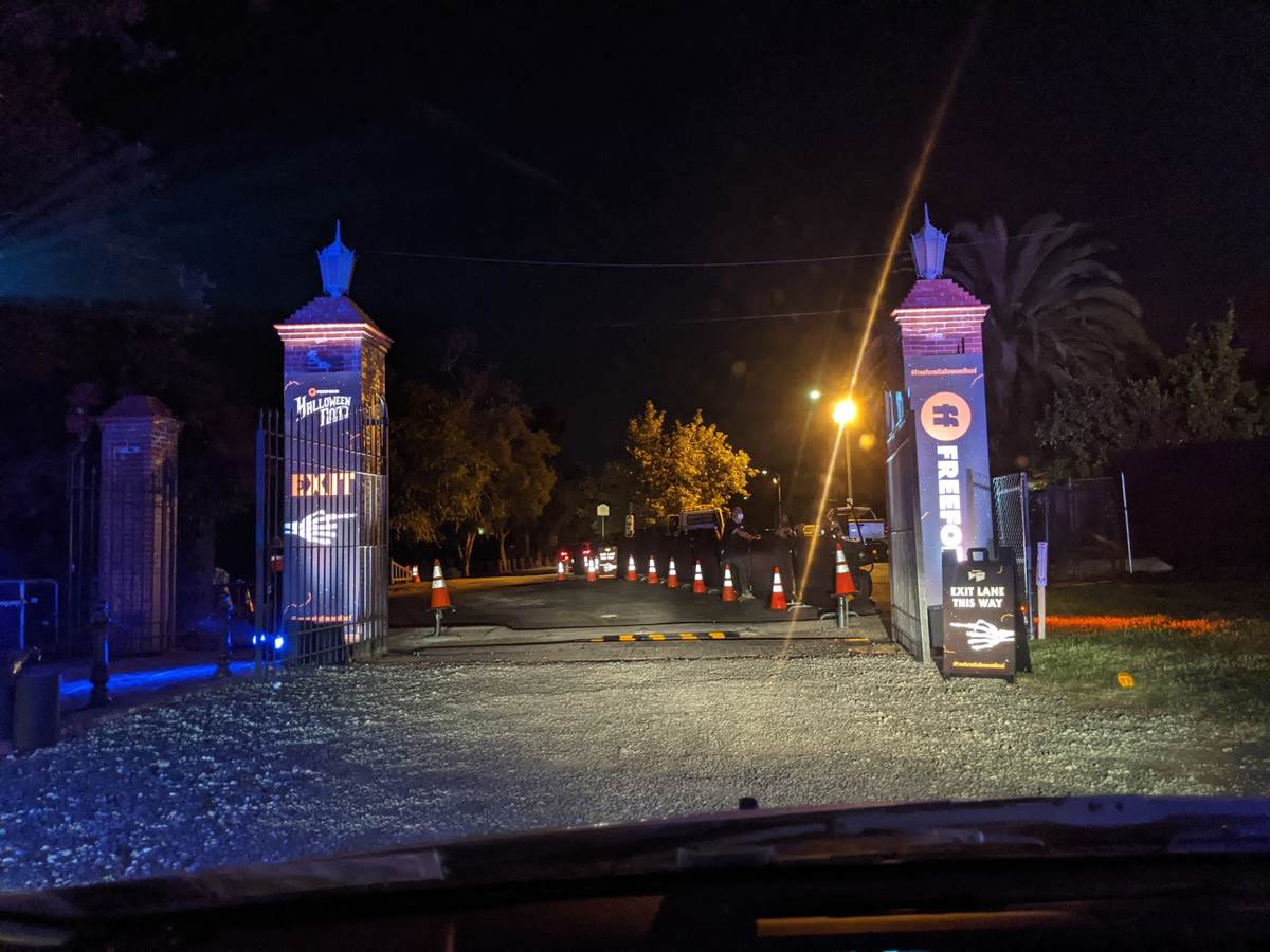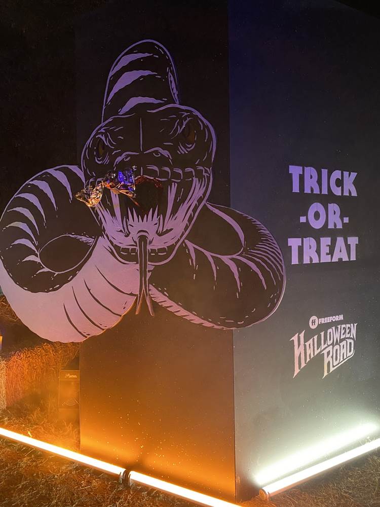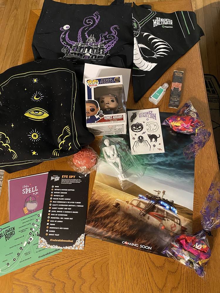 Along the trail, cars were encouraged to stop at several trick-or-treat spots, where an extending claw would come out of a scary tree or hissing snake’s mouth to drop candy in the sack provided. Also in the bag were goodies like a Hocus Pocus hoodie, a Ghostbusters: Afterlife mini-poster, a Gomez Addams Pop! Vinyl figure, a Freeform Halloween Road bandana, and more fun trinkets.