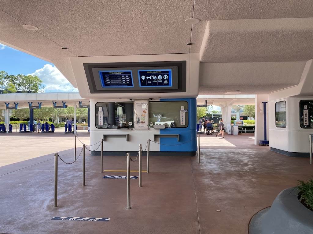During our recent visit to Walt Disney World’s second park, we came across the changes made to the main entry. As guests arrive at the park and before they hit the turnstiles, they’ll see that the ticket booths have been painted white and blue. Also, each booth has one single queue line and social distancing markers on the ground.