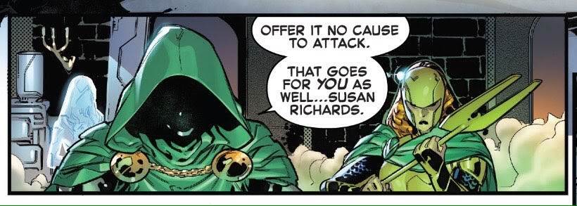 This panel perfectly encapsulates just how always-in-control Doom really is.Tasked with the unenviable mission of stealing something from a Latverian embassy, Susan Richards, AKA the Invisible Woman of the Fantastic Four, tries to sneak in undetected. She is surprised to learn that Doom happens to on the premises but, given her powers of stealth, she appears to get by unnoticed.