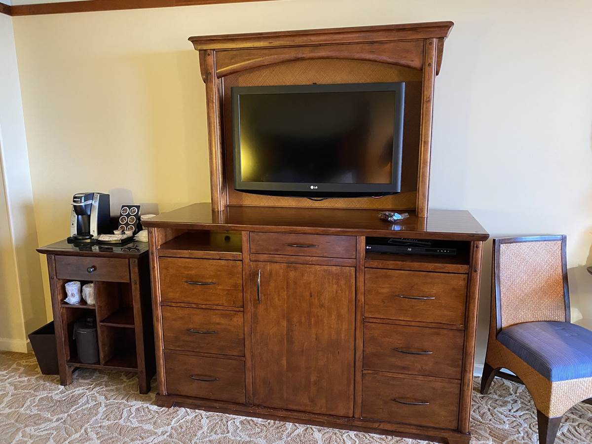 A mini-fridge is in the center of the TV cabinet and next to it is a coffee station. Each room has a Keurig coffee maker and is stocked with coffee and tea pods from Joffrey’s.