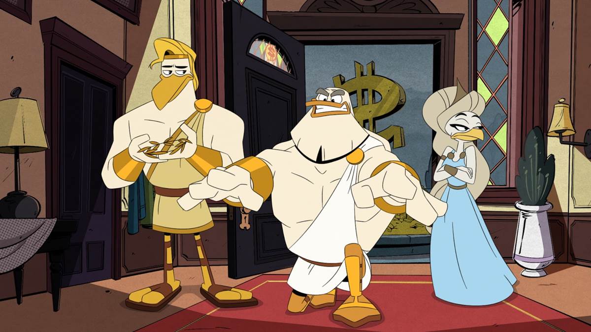 The Greek gods are back in Duckburg in this week’s new episode of the Disney XD DuckTales reboot. It seems Zeus (voiced by guest star Michael Chiklis of The Shield and two Fantastic Four films) has been stipped of his powers due to having been deemed unworthy, and his children Selene (Nia Vardalos from My Big Fat Greek Wedding, appropriately) and Storkules (Chris Diamantopolous of Disney Channel’s Mickey Mouse cartoons) are seeking mortals to claim his powers.