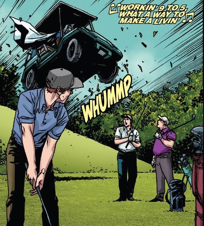Taskmaster is one of the most dangerous killers the Marvel Universe has to offer. He possesses the ability to mirror the skills of anyone so long as he can see them first. That makes him a master at fighting, shooting, archery and just about any other deadly skill you can imagine. So, it’s always going to be hilarious when you see him running away in a golf cart while listening to “9 to 5” by Dolly Parton.