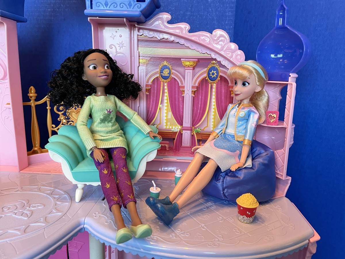 Tiana and Cinderella love chatting and sharing treats in a seashell armchair and beanbag chair.