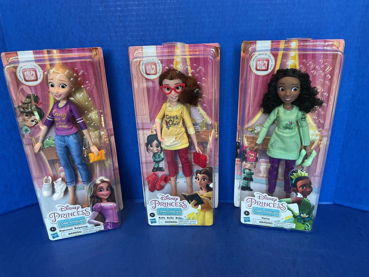 Three Disney Princess Comfy Squad fashion dolls were inside and we got Tiana, Belle and Rapunzel. This new wave of dolls come in different outfits from the ones seen in the film and Hasbro also sells separate outfits they can change into. They have lots of fun story details within each. My favorite is Tiana’s sweater dress, which features the frog prince from the children’s book she and Charlotte read as kids in The Princess and the Frog. Her purple leggings also have glittery golden crowns on them. Each of these dolls retails for $12.99 and other characters in the line include Jasmine, Cinderella, Ariel and Aurora. You can also get the entire first wave of dolls in their looks from Ralph Breaks the Internet in an Amazon exclusive box set.