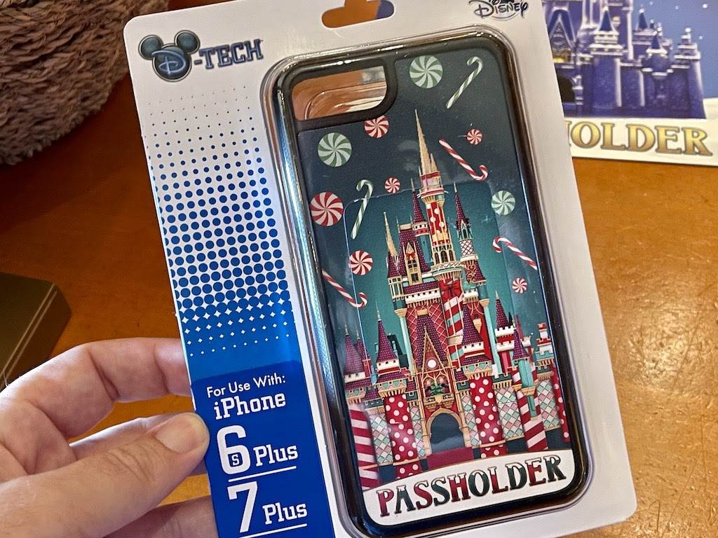 Fans will love the Christmas tree-shaped magnet that serves as the backdrop of a colorful, candy coated Cinderella Castle. Snowflakes give the scene a whimsical touch, and below the image is the word “Passholder” in all capital letters. This castle design is similar to the look on the phone case.