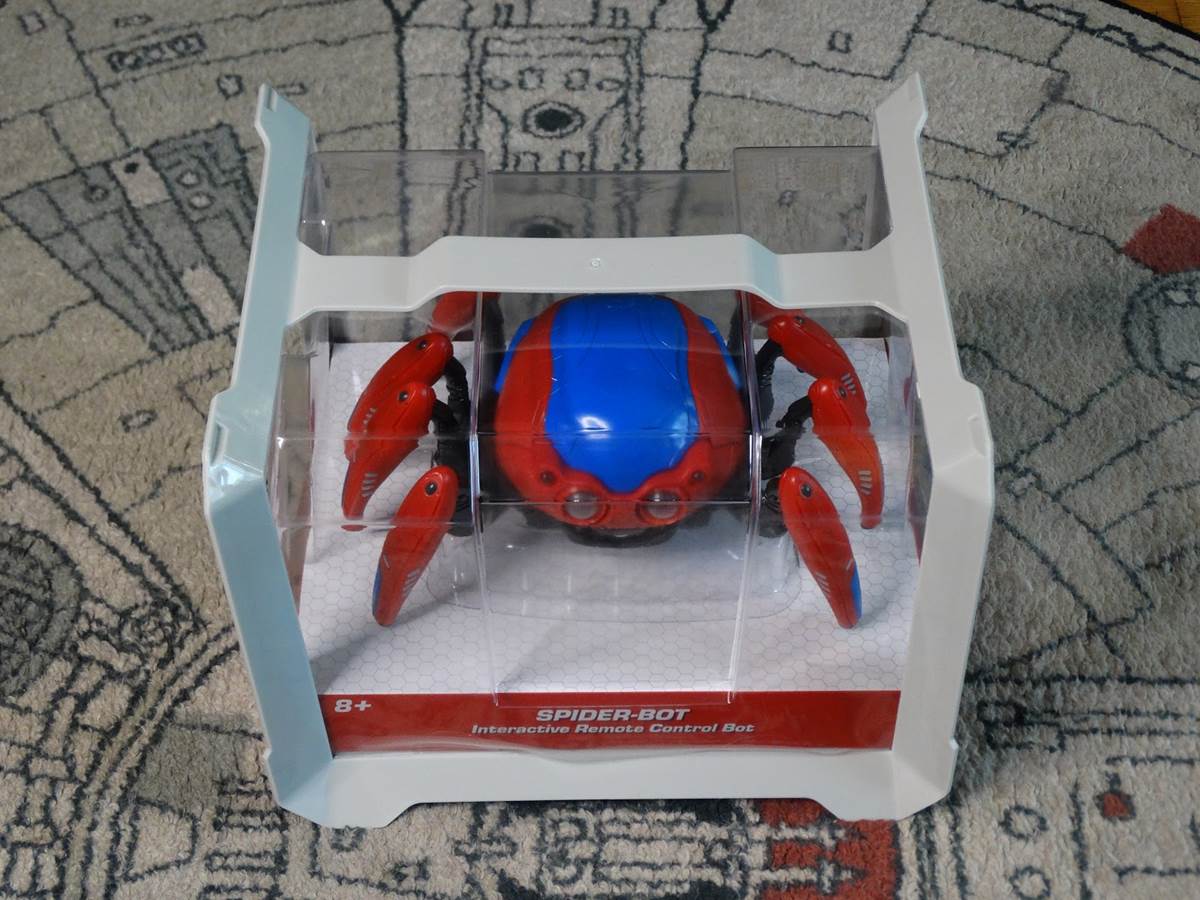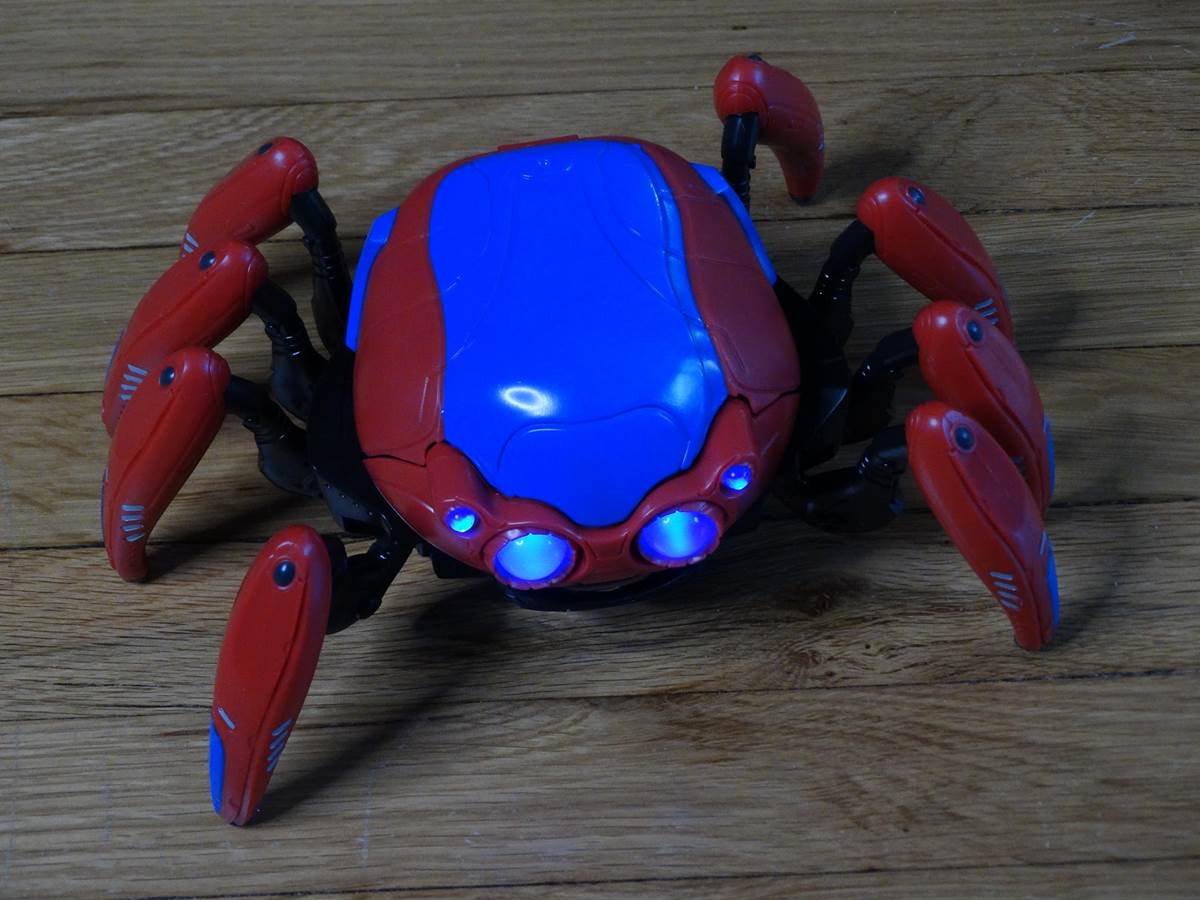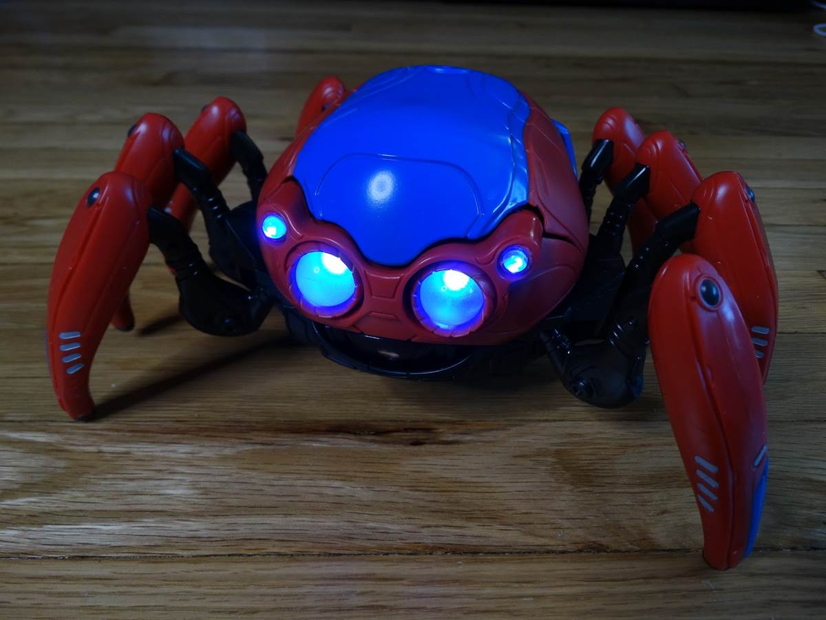 The Spider-Bot Interactive Remote Control Bot is recommended for ages eight and up, and features 360-degree movement, battle game play, a “projector shield,” light-up eyes, crouching ability, and fun sounds. As you’ll see in the above video, I had some trouble getting my Spider-Bot to move forward gracefully-- it struggles in this capacity on a variety of surfaces, although the backwards movement and rotation work pretty well. It’s also tough to get the complete idea of what this toy is capable of with only one copy. The battle functions (including both standard and deluxe blasters, a digital life meter, shields, and defensive maneuvers) don’t really mean much when it’s just the one Spider-Bot. The self-destruct option does provide a chuckle when you hold down the center button, however, and the glowing blue eyes (that flash red when firing the different blasters) partnered with its built-in sound effects also give the item an effective presence.
