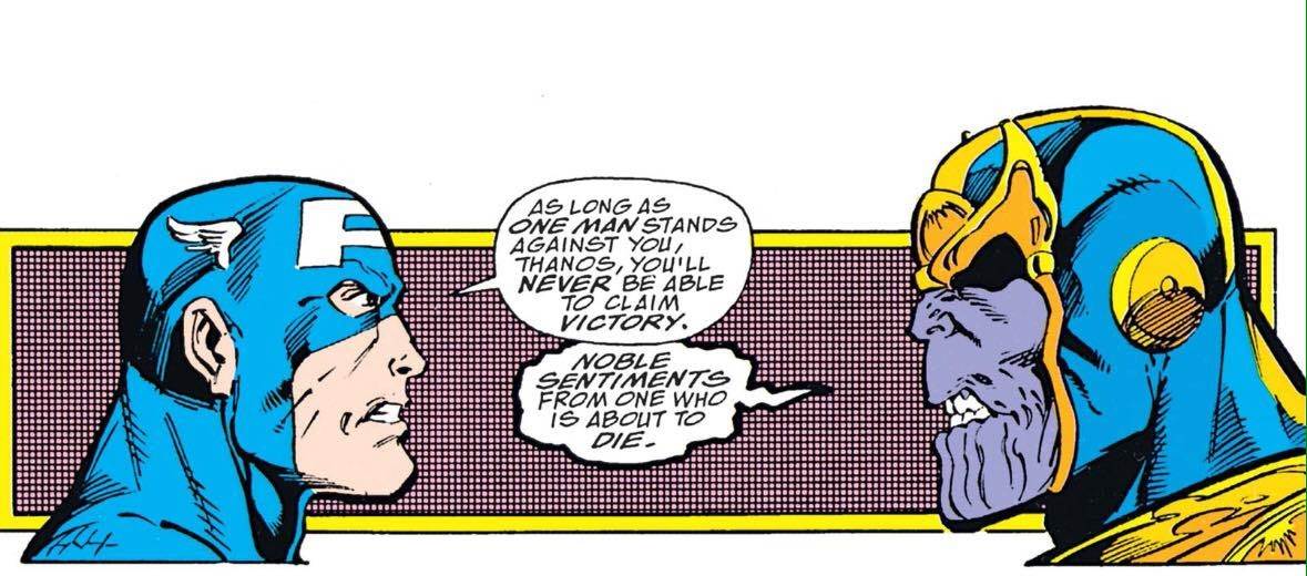 It goes without saying that “Infinity Gauntlet” is one of the most iconic Marvel Comics stories of all time. And thanks to the Marvel Cinematic Universe, the story has seen a resurgence in popularity. Well, the comic story is a bit different from the movies, but it still has this great faceoff between Cap an Thanos.