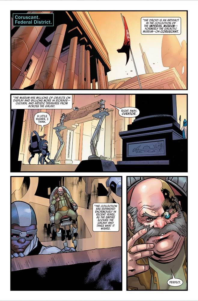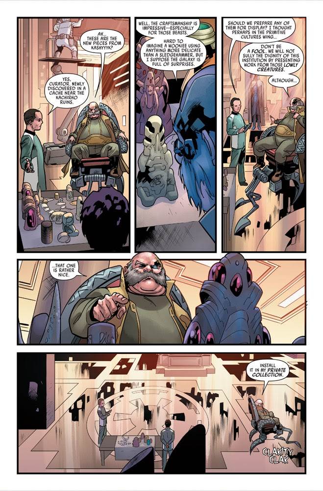 Naturally the curator of said museum isn’t the nicest guy in the galaxy, but Leia assembles a crack team to travel to the Imperial-controlled city-planet as a plan of attack. Yeah, it’s another heist story in a Star Wars comic, but at least the crew put together here is an interesting one: we get to see the SpecForce Pathfinders in action-- Kes Dameron (Poe’s father) and a couple cool-looking aliens called Needle and Frell-- alongside poor Lando Calrissian (who wishes he could be anywhere else) and his buddy Lobot, who has the tools and knowhow to hack into the museum’s computer. As you might guess, the scheme doesn’t go perfectly, but it’s fun to see what these characters are capable of in this kind of situation regardless.