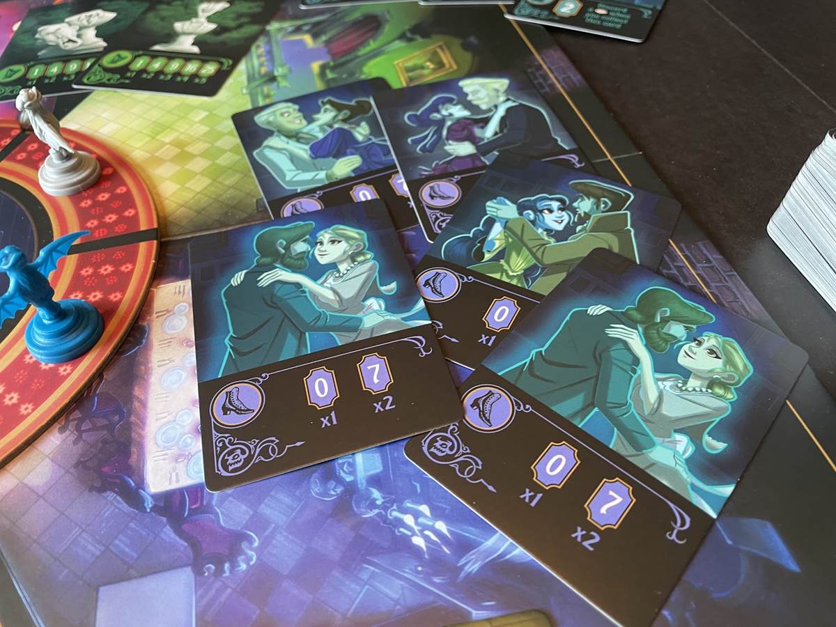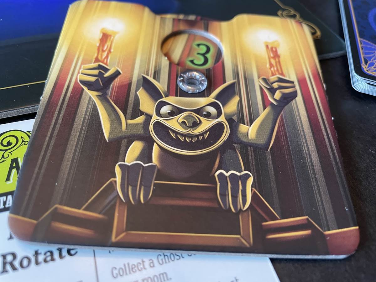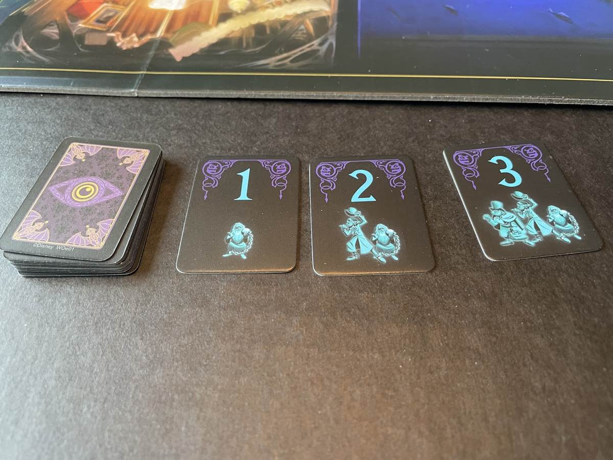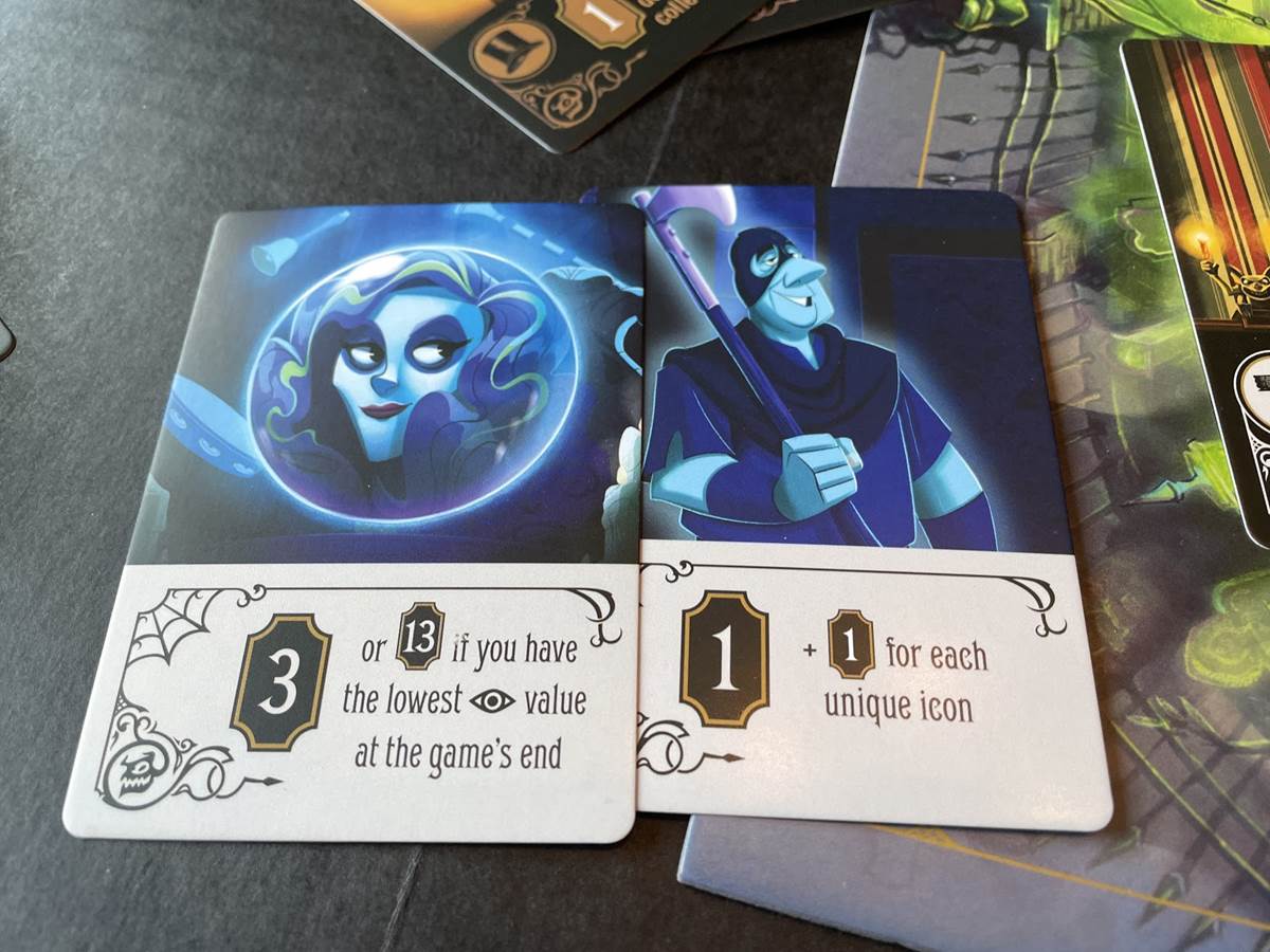 Special ghosts come with extra rules for adding points at the end. In the Madame Leota card, there’s an eyeball symbol, which references the Haunt Cards. What a perfect segue!