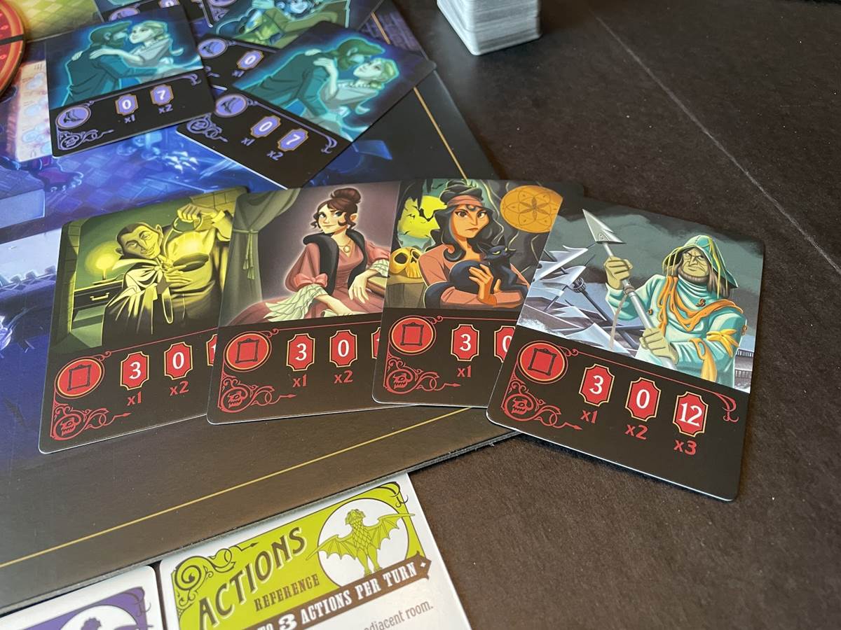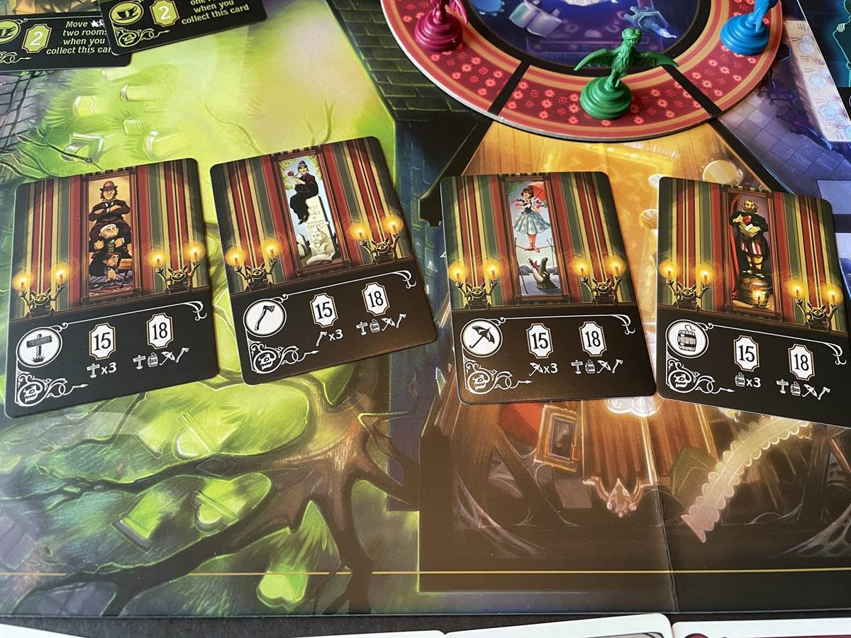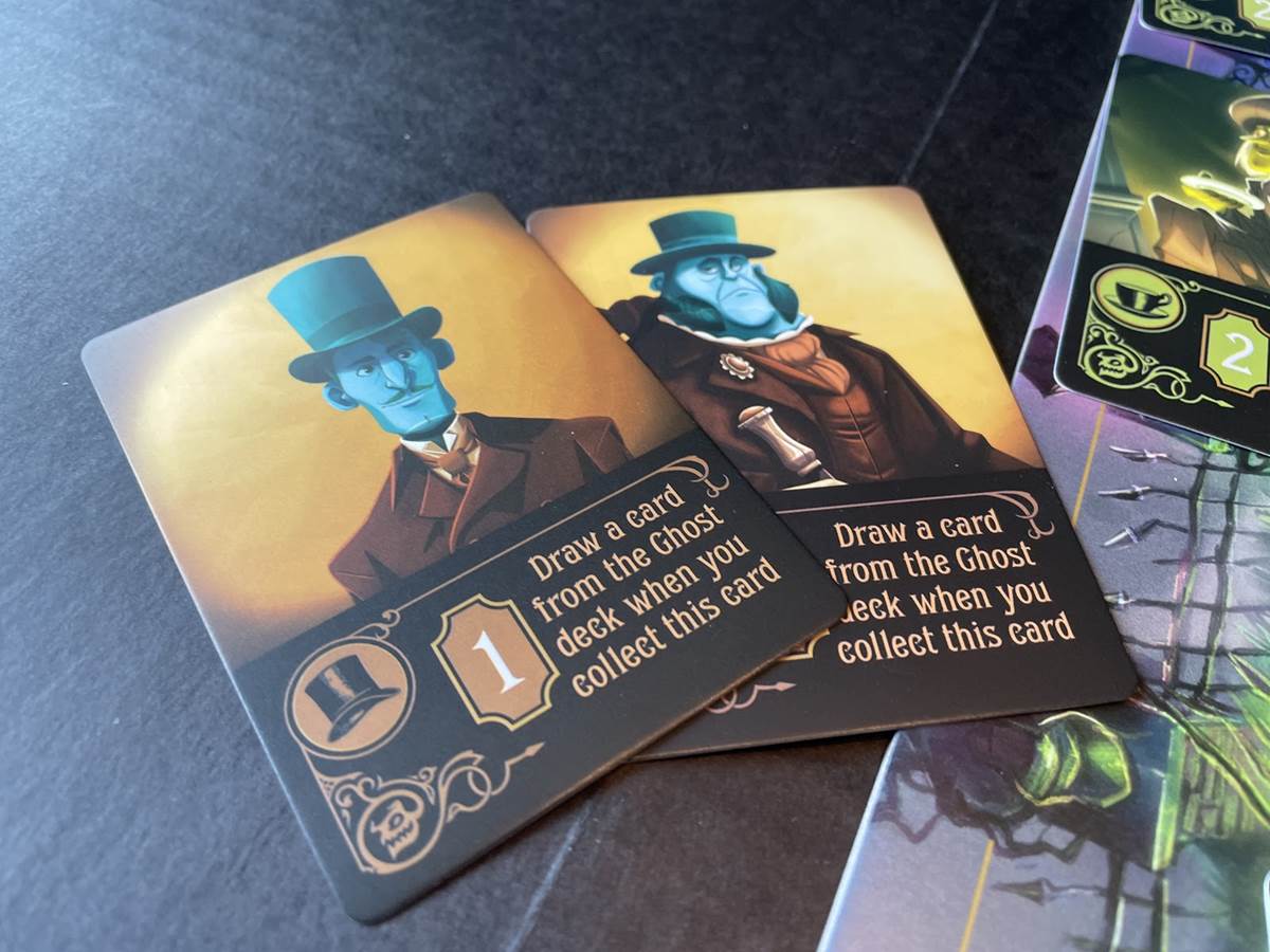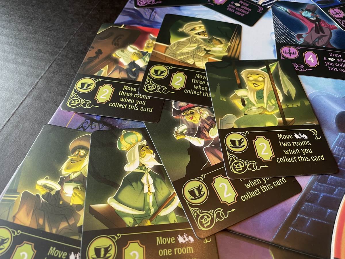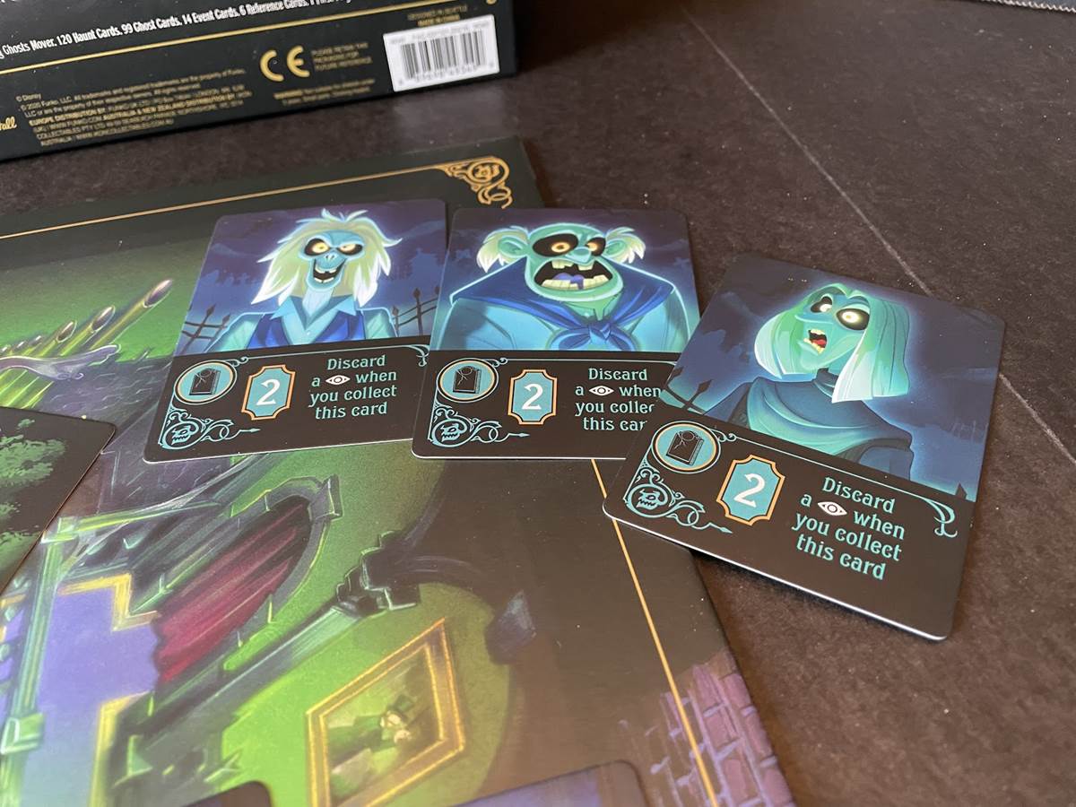 That’s right, this game has hitchhiking ghosts, so beware! The figure travels through the board as dictated by event cards, which are drawn at the start of each round. When you’re trying to collect ghost cards from a room with the hitchhiking ghosts, you end up taking on more haunt cards. Also just stopping by their room will earn you at least one. These guys are bad news!