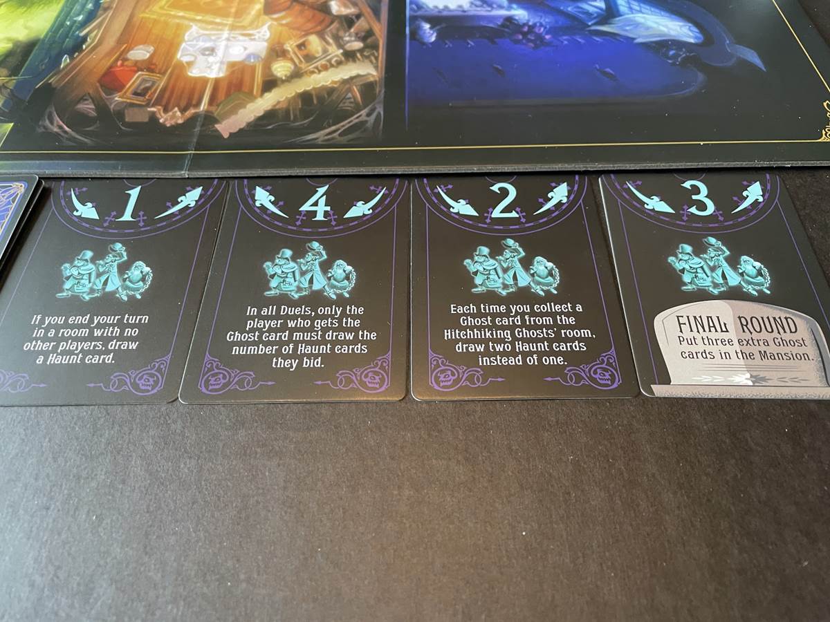 These are event cards. They tell you which way the hitchhiking ghosts move at the start of a round and which direction they go. When you set up the game, you find the “Final Round” card and shuffle it within the bottom 3 cards of the event deck, so you don’t actually know the last turn is about to come. Otherwise you’d have time to “Make final arrangements” and adjust your cards in advance of your last turn and that would just be unfair.