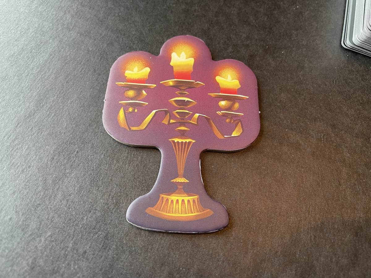 Since each player gets to make 3 actions during their turn, a floating candelabra helps keep track of who’s turn is first on the next event. It’s not hard to remember when it’s just 2 players, but if you had a big party, this would definitely come in handy.