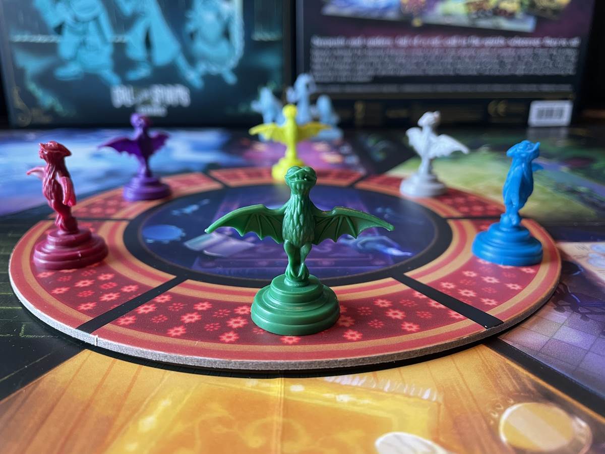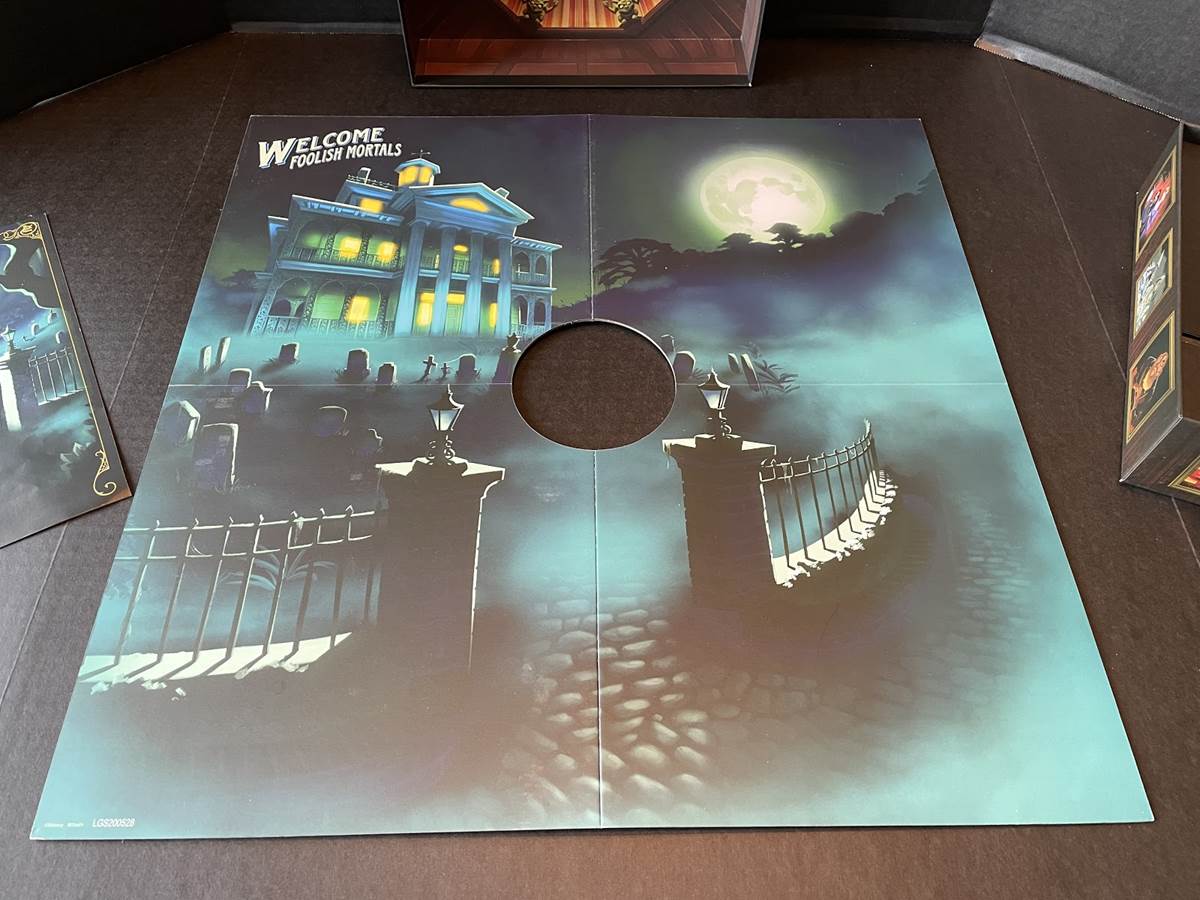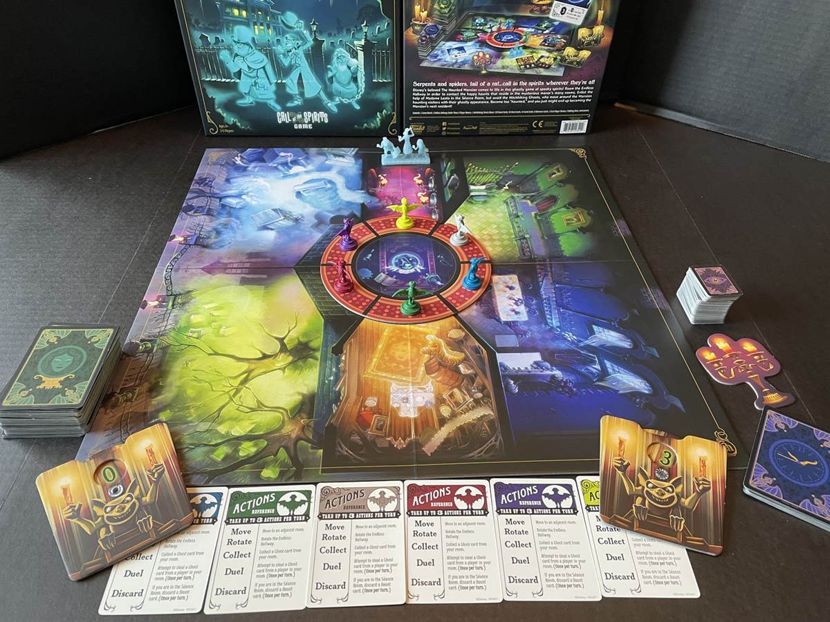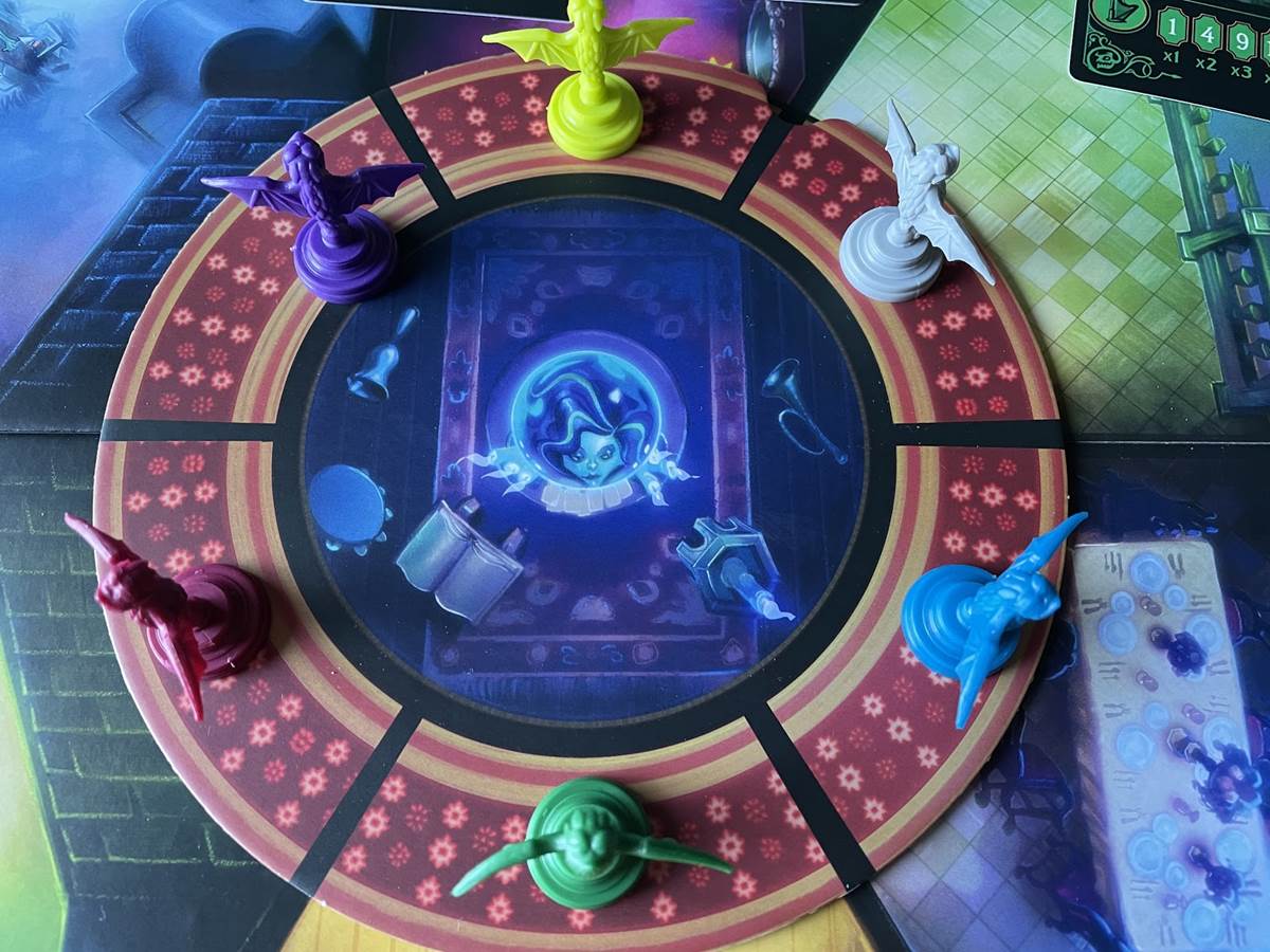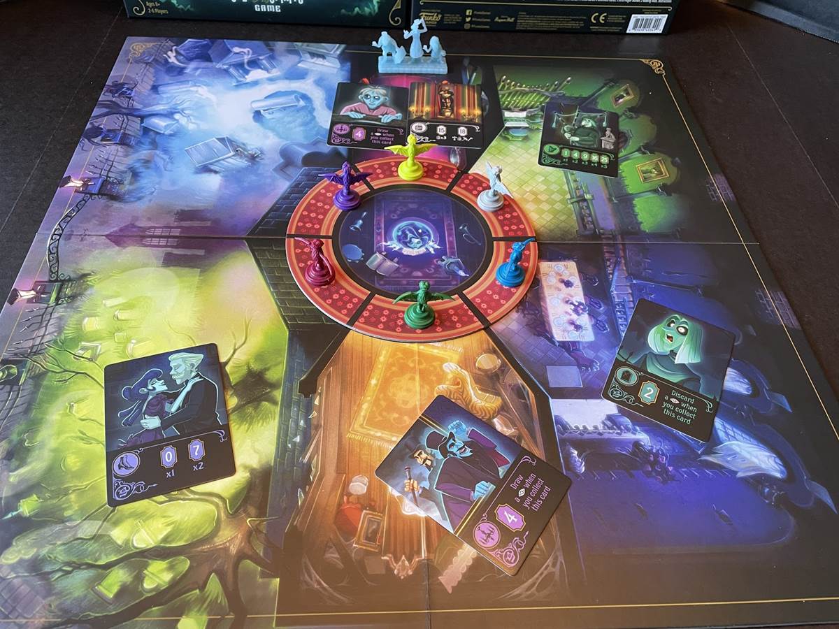 The colorful board splits the mansion into six rooms connected by a rotating endless hallway with Madame Leota’s séance room in the center. In terms of moving your pawn, players only really move between the séance room and the endless hallway.