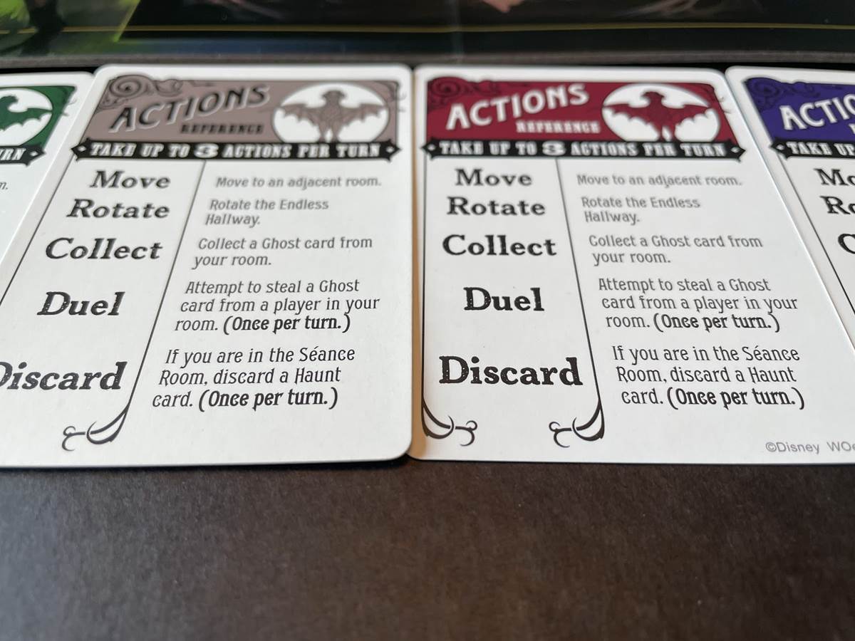 At the start of each event, ghost cards are distributed around the board starting with the room the hitchhiking ghosts are in. The number of ghost cards varies depending on how many players are in the game. It’s always the number of players +3, which is easy to remember. Then players use their turn by either staying where they are and spinning the endless hallway or moving around it until they reach the room they want to be in. Each action eats up one of your 3 allowances per event, so choose them wisely. Drawing a ghost card is considered an action, but hypothetically if you were already in a room with 3 cards, you could pick all 3 cards as your 3 actions.