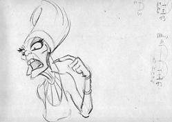 Disney Legend Andreas Deja was the original supervising animator for her character. Known for his work on previous villains Gaston, Jafar, and Scar, Deja dreamt of animating a female villain, similar to Marc Davis’ work on Maleficent in Sleeping Beauty. Deja also fell in love with the character of Yzma and the idea that her villainy is rooted simply in her vanity, that she just wants to be young and beautiful, “very very vain, very simple, old and wrinkly, just a bunch of bones, and wants to be young again," and he was excited to work on such a campy, over the top character.