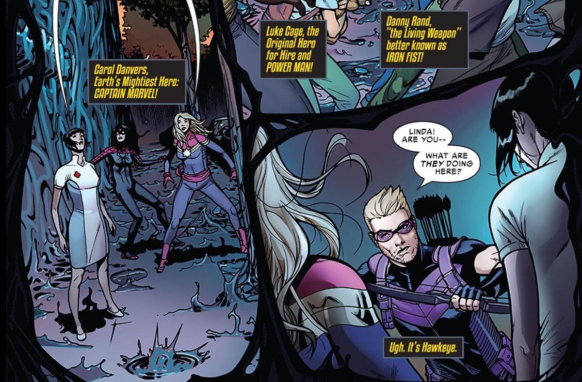 As they try to fight their way out of certain doom, a small team of heroes assembles, consisting Spider-Woman, Captain Marvel, Luke Cage, Iron Fist and… ugh… Hawkeye. At least, that’s how Jessica Drew presents the lineup in this issue, as she has some… history with Clint Barton.